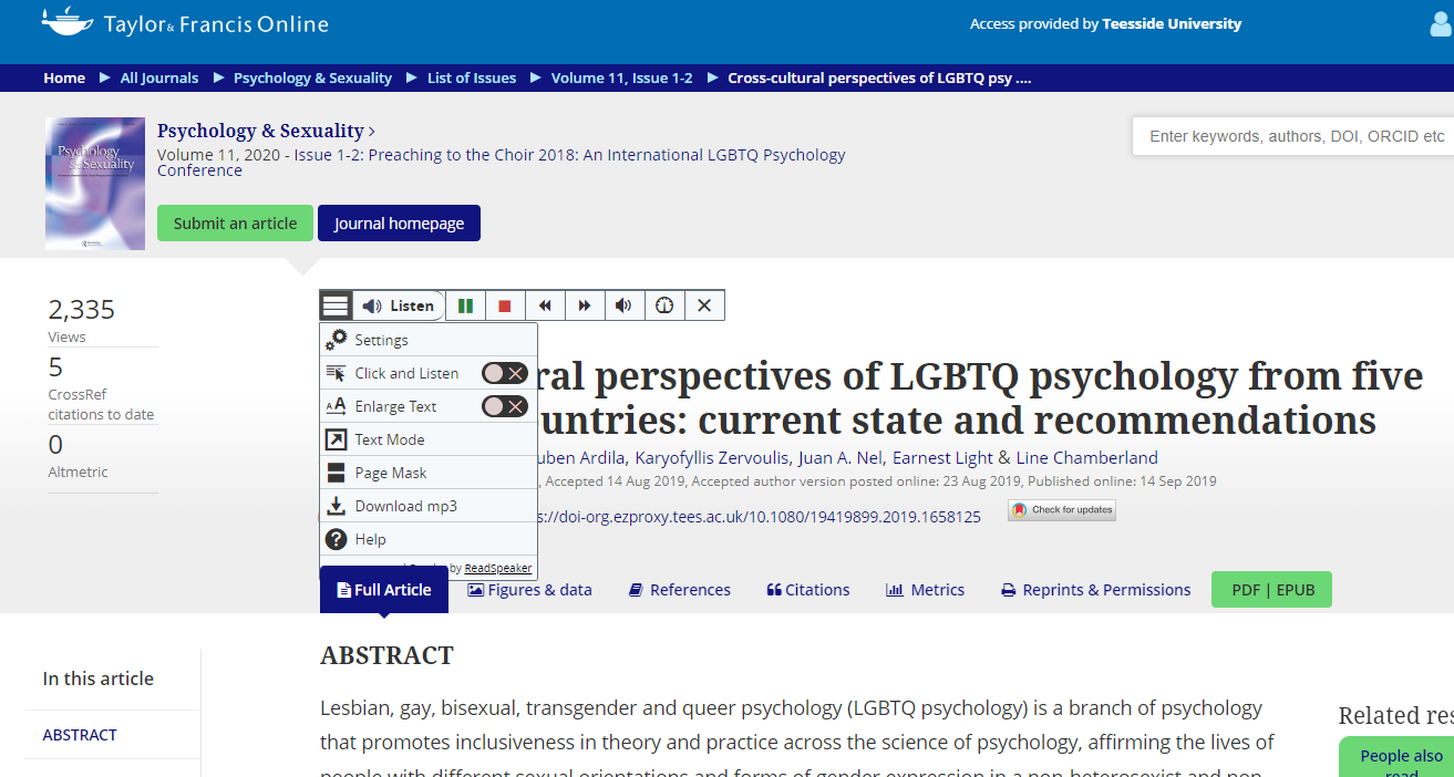This Listen function is also available via Taylor and Francis Online