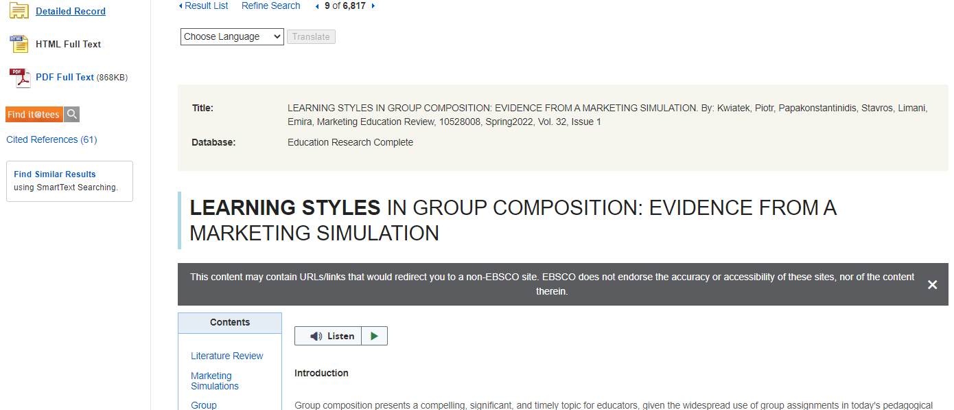 The databases we have access to at Teesside University also come from a variety of suppliers. Again this will mean that the tools which are available (including audio options) will differ.