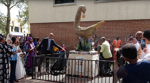 The mythical creature, which sits in the same site where the Confederate monument once stood, is an adinkra symbol from the Akan people of Côte d’Ivoire and Ghana and serves as a reminder to bring the past forward to remember, amend, and understand and indicates the pursuit of knowledge.