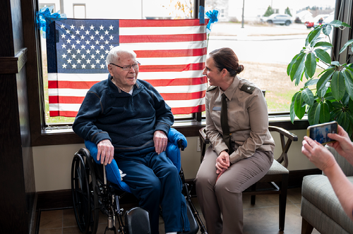 U.S. Army Brig. Gen. Jackie Huber speaks with retired Master Sgt. Milton Westgard, who served in the 164th Engineer Battalion, a unit that she commanded 53 years after he retired, Nov. 6, at Baptist Health and Rehab in Bismarck, ND.