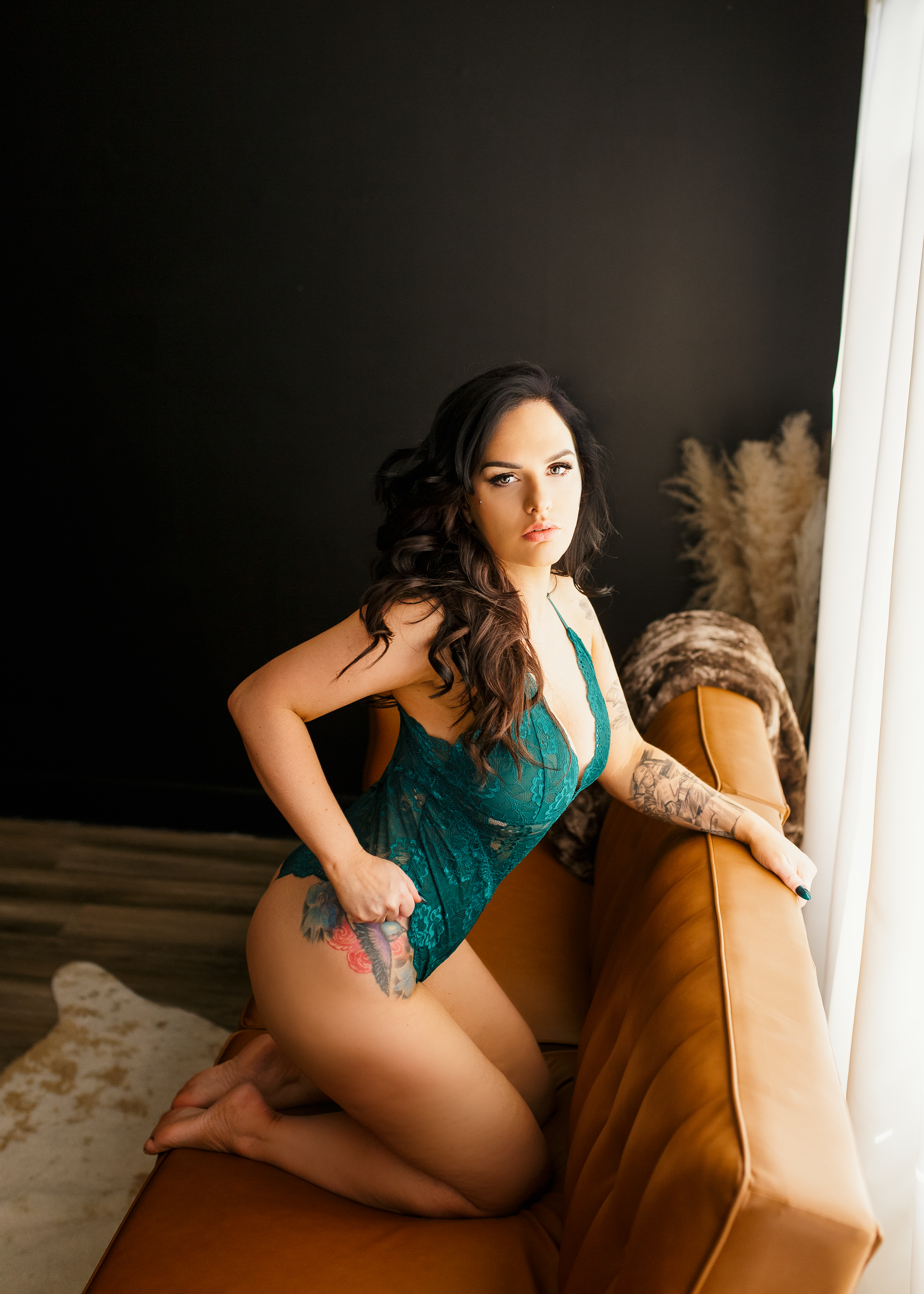 I recommend 2 - 3 well-fitting lingerie pieces. Lingerie pieces can range from very sexy crotchless, modest bralettes with ripped jeans, oversized tee shirts and tube socks, to off the shoulder sweaters. Bodysuits & teddys are my absolute favorite because they are flattering on all body types. I have a wide range of lingerie staples in my client wardrobe closet that you are welcome to try on. Black and jewel toned pieces photograph beautifully. I would steer clear of any neon colored lingerie. Team Jerseys and babydoll lingerie often tend to be thick, heavy, boxy fabric that does not show off your gorgeous shape.