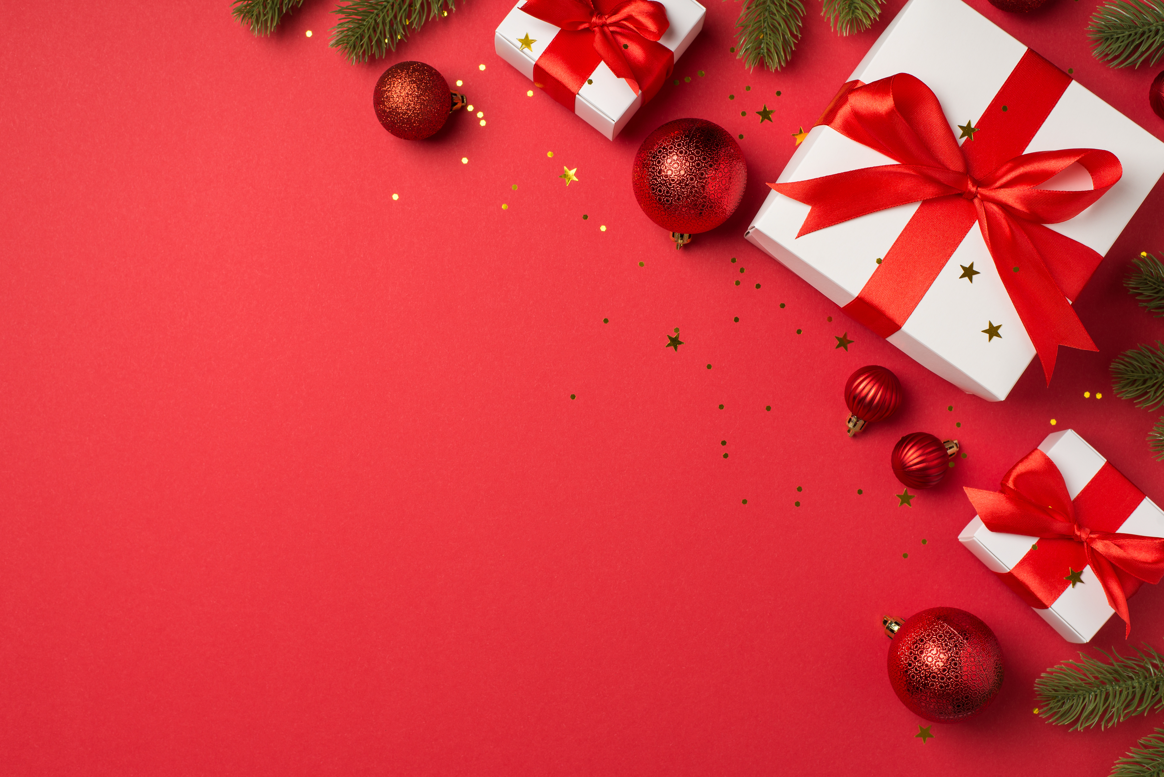 Created with images by ActionGP - "Top view photo of red christmas tree balls pine branches white gift boxes with ribbon bows and golden confetti on isolated red background with copyspace" โข Sebastian Duda - "Sports balls with equipment" โข Andrii Zastrozhnov - "Address mailing of news by e-mail. Advertising message on red background."