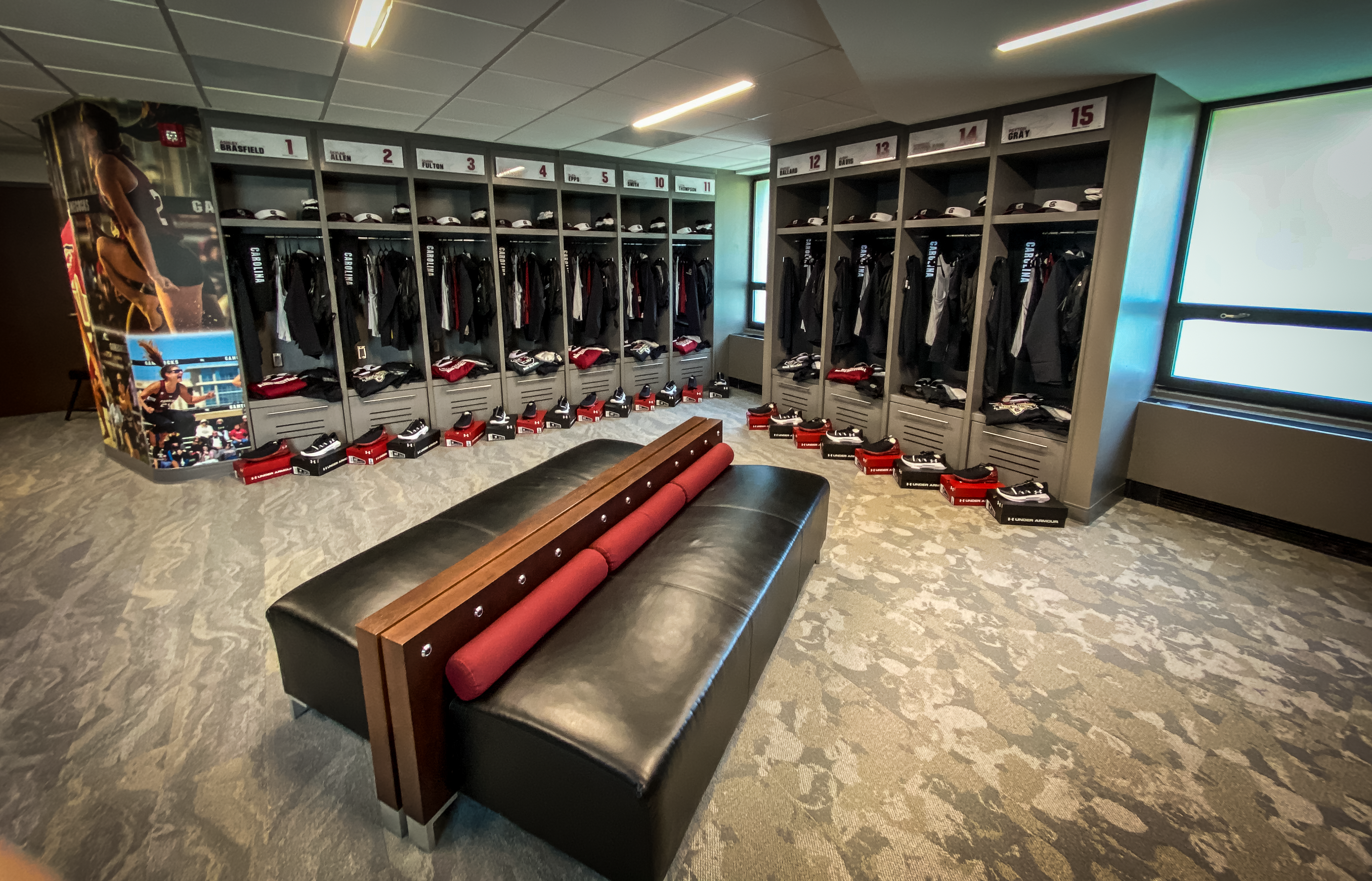 The beach program has one of the newest locker rooms at South Carolina and it includes a separate team area for video review and other amenities for entertainment.