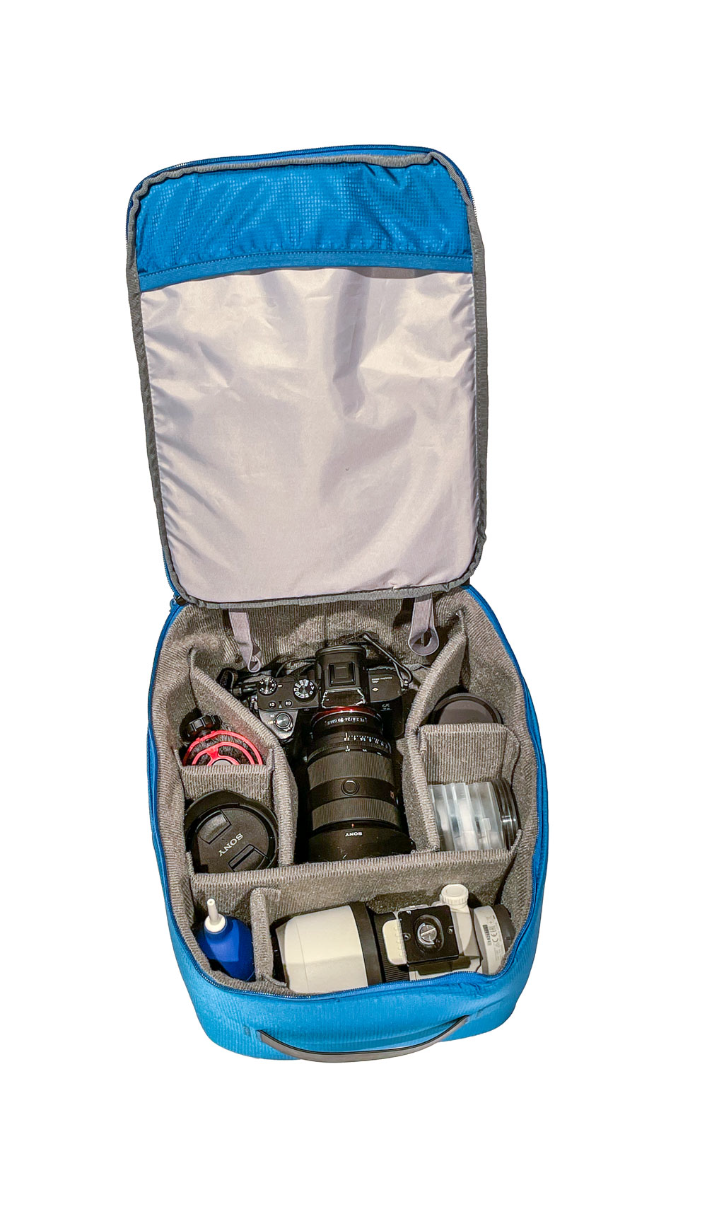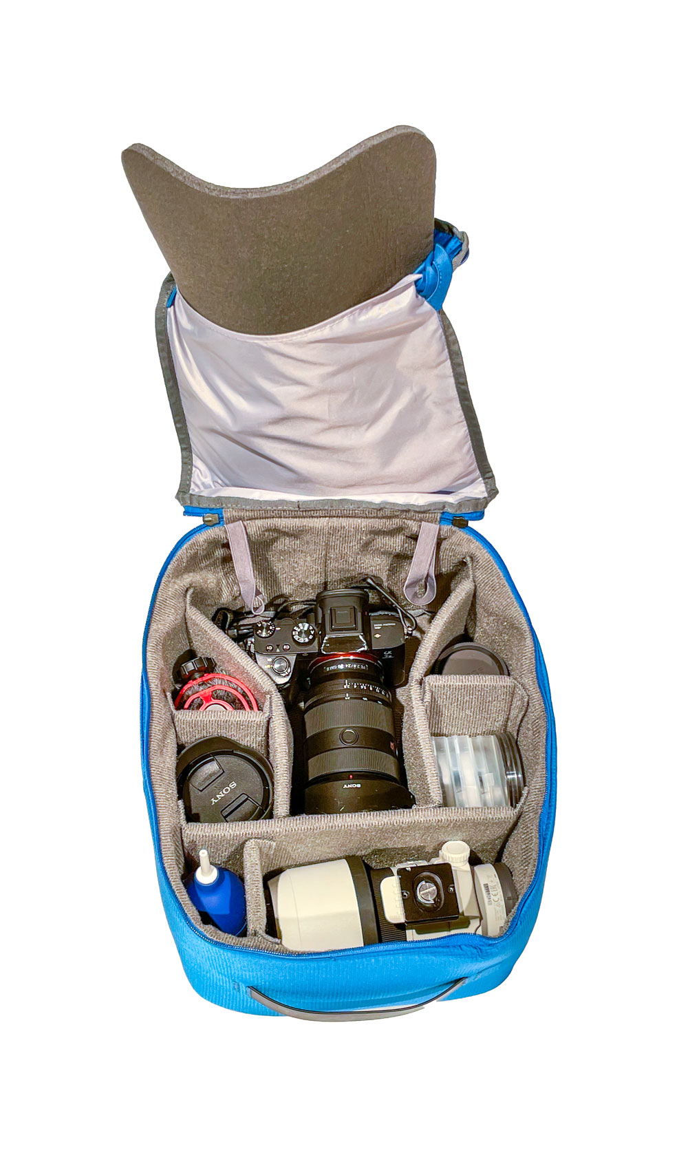 Die Kamerabox macht den Jayback 36 zum Fotorucksack. Und da geht einiges rein. Bei uns z. B. eine Spiegellose Kamera mit vier Objektiven: 2.8/24-70 mm, 1.8/20 mm, 4/70-200 mm und einer 50 mm Festbrennweite. Außerdem Filter, Mikro und Blasebalg. Ausreichend Trennelemente werden mitgeliefert. Wir haben bei unserer Einteilung nicht alle gebraucht. Die Kamerabox kann auch ohne Jayback genutzt werden, dann bekommt das Deckelfach zum Schutz der Ausrüstung auch ein Schaumstoffelement und die Box auch solo verwendet oder in jedem anderen Rucksack, der groß genug ist, verstaut werden.
