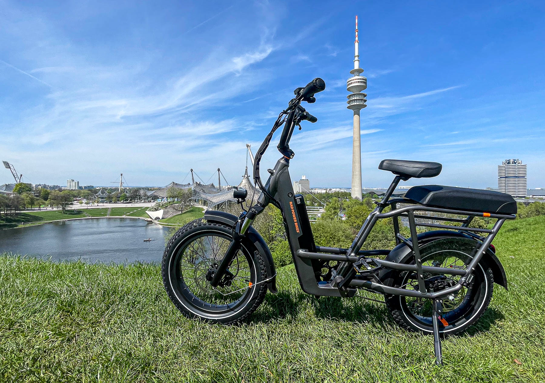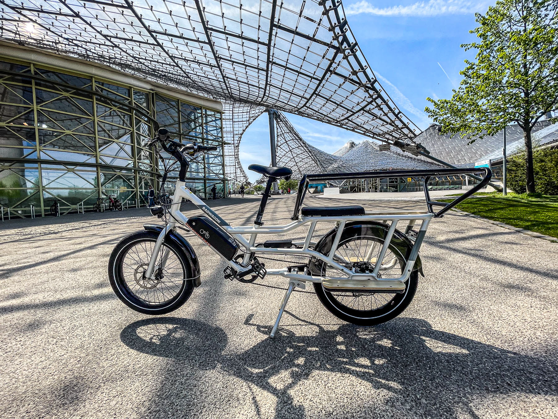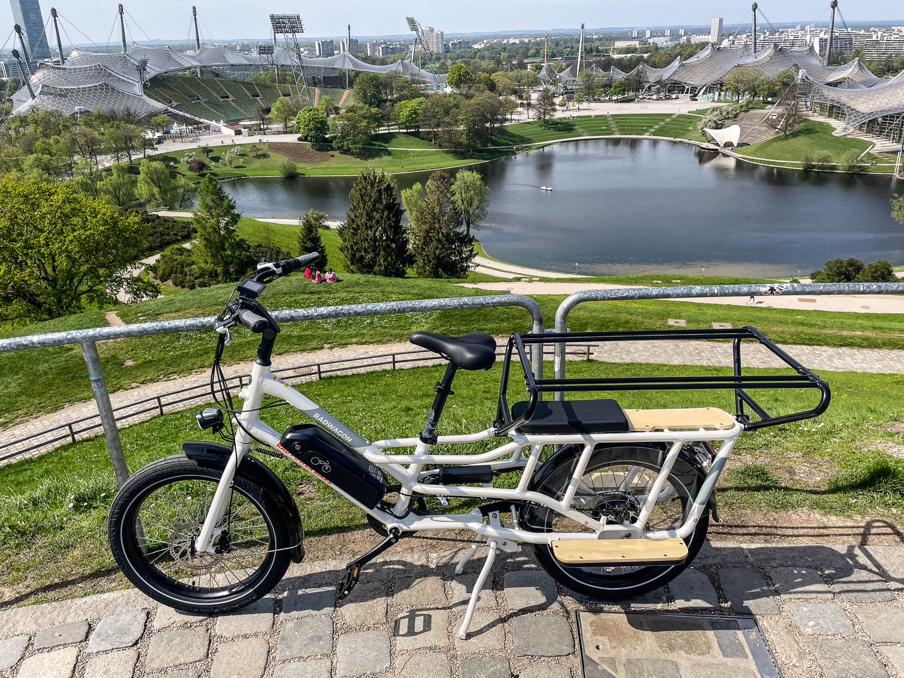 Die Spitzkehren dort sind eine echte Herausforderung, es waren auch Spaziergänger unterwegs und daher nicht jede Kehre flüssig zu nehmen. Stehen bleiben in der Steigung ist da immer blöd. Hier half dann die Schiebehilfe, das Gefährt wieder in Schwung zu bringen. Downhill ging es dann offroad steil bergab, dann quer über die Wiese zum Biergarten Olympiaalm und über die Winterrodelstrecke zurück zum Olympiasee. Unruhen im Fahrwerk gab es nicht. Mein Fazit nach dieser kurzen Testfahrt: Für die Einkaufstour voll geeignet, die fetten 3"-Reifen nehmen den Straßenbahnschienen ihren Schrecken und das Cargobike ist für Leute mir kleinem Geldbeutel nicht unerreichbar. Das RadWagon ist erhältlich bei Rad Power Bikes für 2.299 Euro.