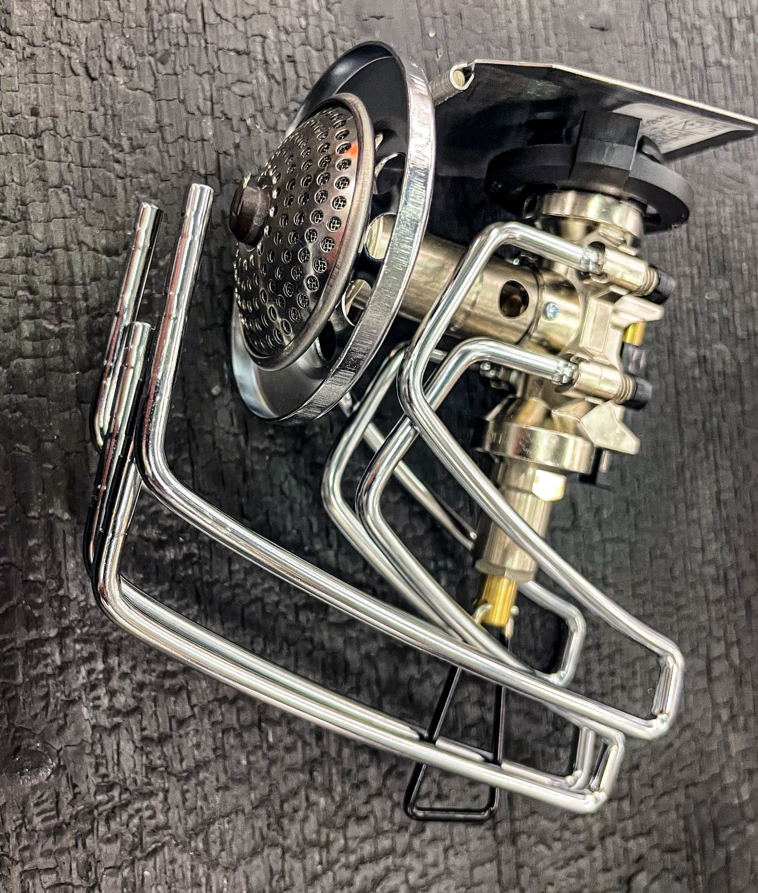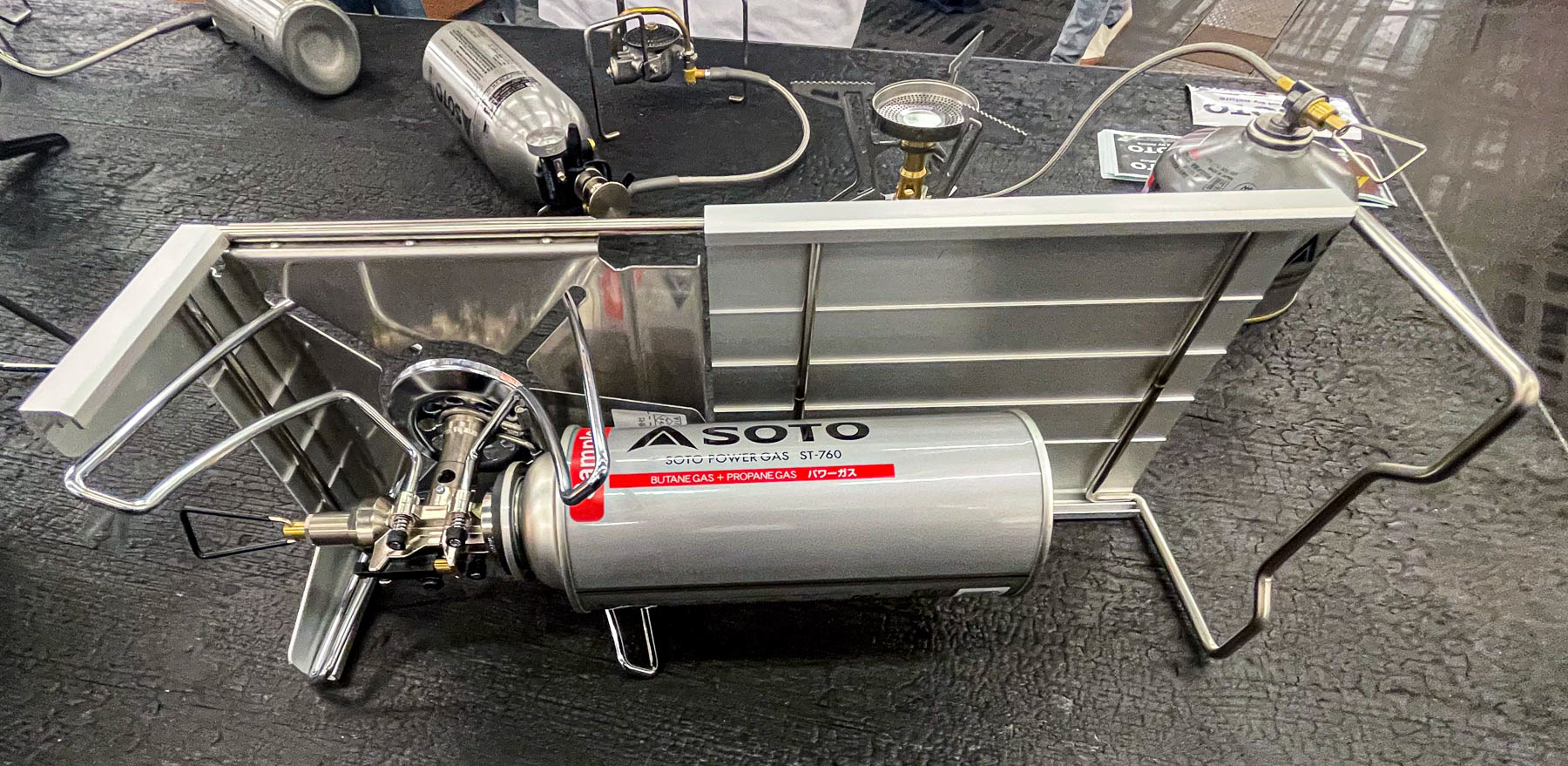 Dieses Arrangement haben wir auf der Outdoor by ISPO entdeckt, ob es den Weg bei uns in den Handel findet, wird sich zeigen. Hoffen tun wir es, denn diese in seine Einzelteile zerlegbare Kombi ist eigentlich ideal für alle, die mit kleinen CamperVans unterwegs sind und sich bei dem, was sie mitnehmen können, etwas einschränken müssen. Das hier wäre der Kocher für alle Fälle. Im Camp tritt er als solider Tischkocher auf mit kleiner Arbeitsfläche und verwandelt sich in Null-Komma-Nix zu einem kompakten Outdoor-Kocher für eine Rucksack- oder Bikepackingtour. Die Gasflasche lässt sich fest mit der Gasleitung verbinden.