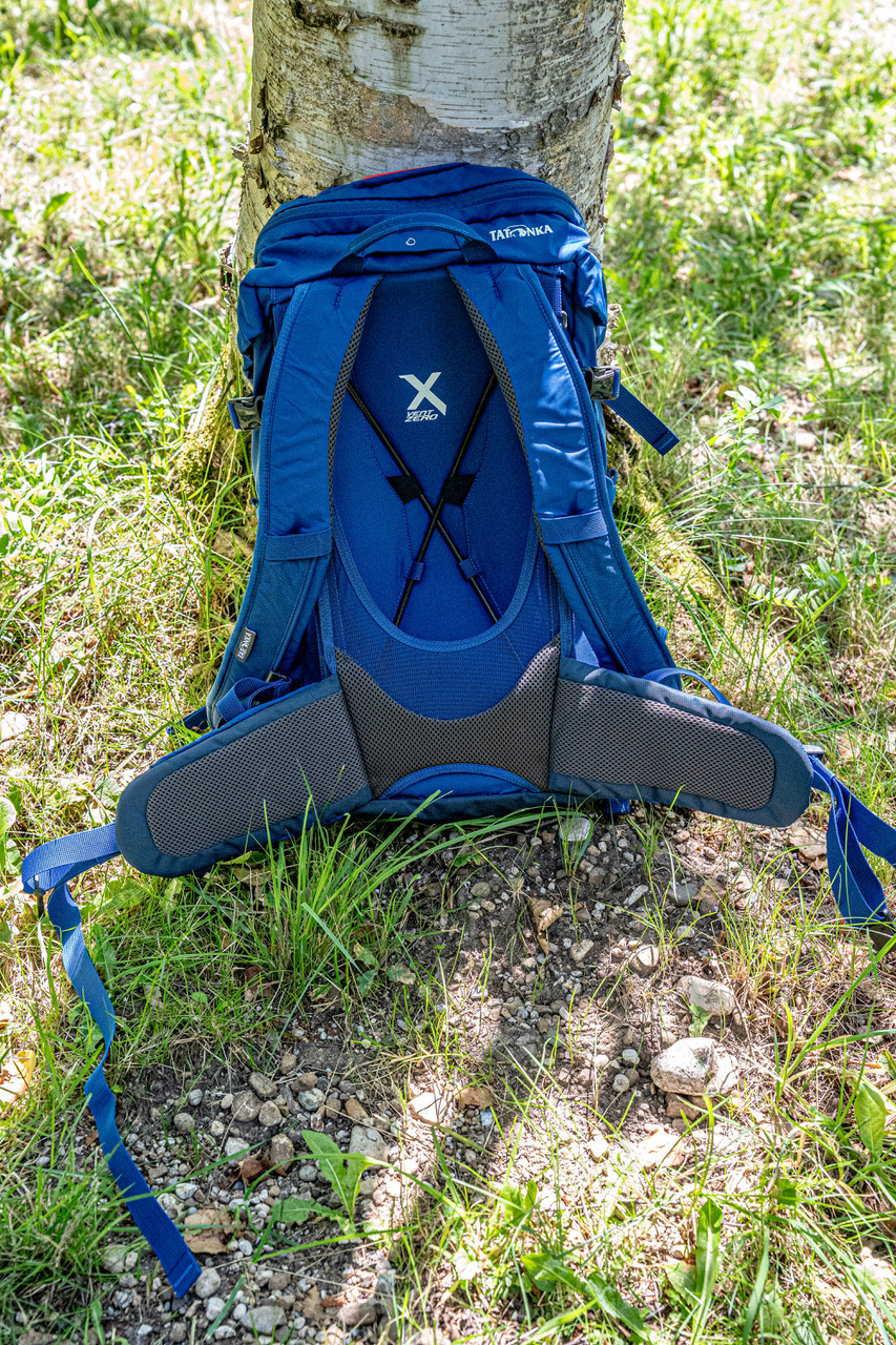 Tatonka sagt zur STORM-Serie: Mehr Belüftung geht nicht. Das konnten wir in den letzten Tagen schon mal testen bei Außentemperaturen von deutlich über 30° Celsius. Warum das so ist, lässt sich am zweiten Foto leicht erkennen. Durch die Art der Konstruktion liegt der Rucksack nicht direkt am Rücken auf (etwa 60 % weniger Auflagefläche auf dem Rücken als ein Netzrückensystem). Außerdem kann das System stufenlos auf- und abgespannt und somit individuell eingestellt werden. Wenn nötig, lässt sich also auch der Abstand Rucksack zum Rücken verringern.