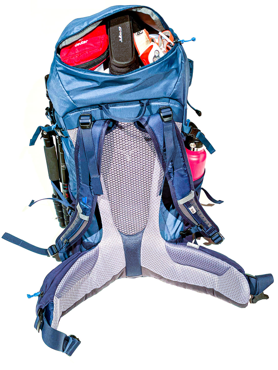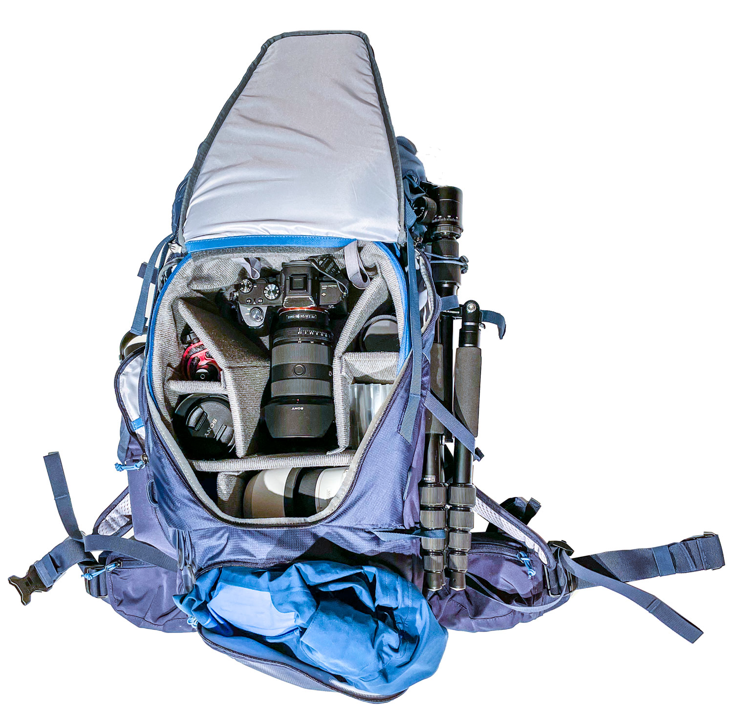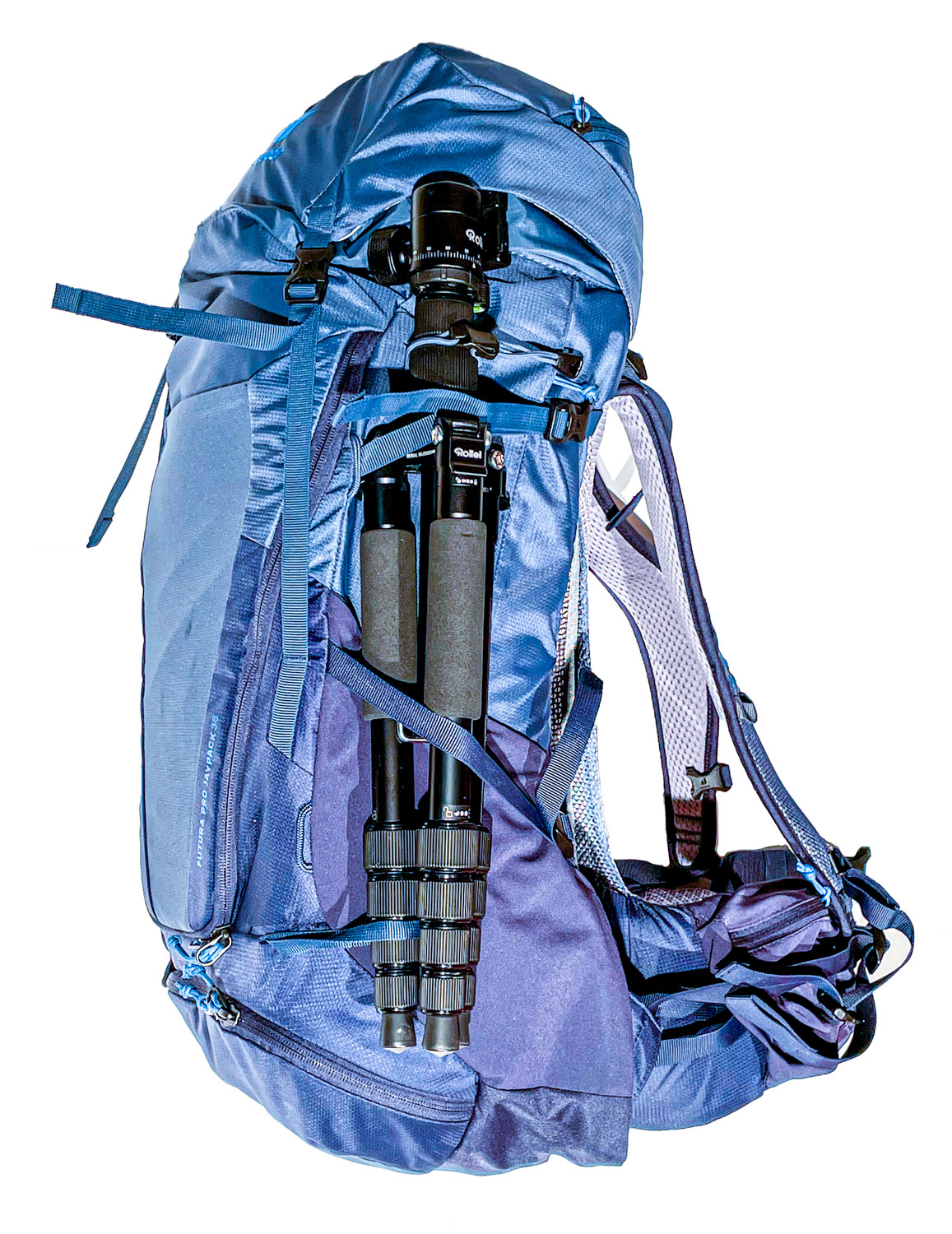 Der Rucksack mit einem Volumen von 36 Liter (gefühlt mehr) hat auch mit der Kamerabox genügend Platz für all die Dinge, die auf einer Wochenendtour gebraucht werden. Zusätzliches fotografisches Zubehör wie Speicherkarten, Filter und Akku findet in einer großen Reißverschluss-Seitentasche mit zwei elastischen und einer kleinen Reißverschluss-Mesh-Innentasche Platz. Persönliche Gegenstände, Wertsachen, Trinkflaschen und Wechselkleidung kommen ganz bequem in der geräumigen Deckeltasche, dem separaten Bodenfach, den Innenfächern, zwei elastischen Seitentaschen, einer seitlichen Balgtasche und einer elastischen Frontstecktasche unter. Seitliche Kompressionsriemen sichern die Ladung körpernah und an der Stock- und Pickelhalterung lässt sich auch gut ein Stativ transportieren und natürlich, von Deuter auh nicht anders zu erwarten, ist eine Regenhülle mit dabei. Gewicht: 2340 g; Volumen 36 Liter; Maße 61 / 32 / 24 (H x B x T) cm; Preis: 320,00 €.