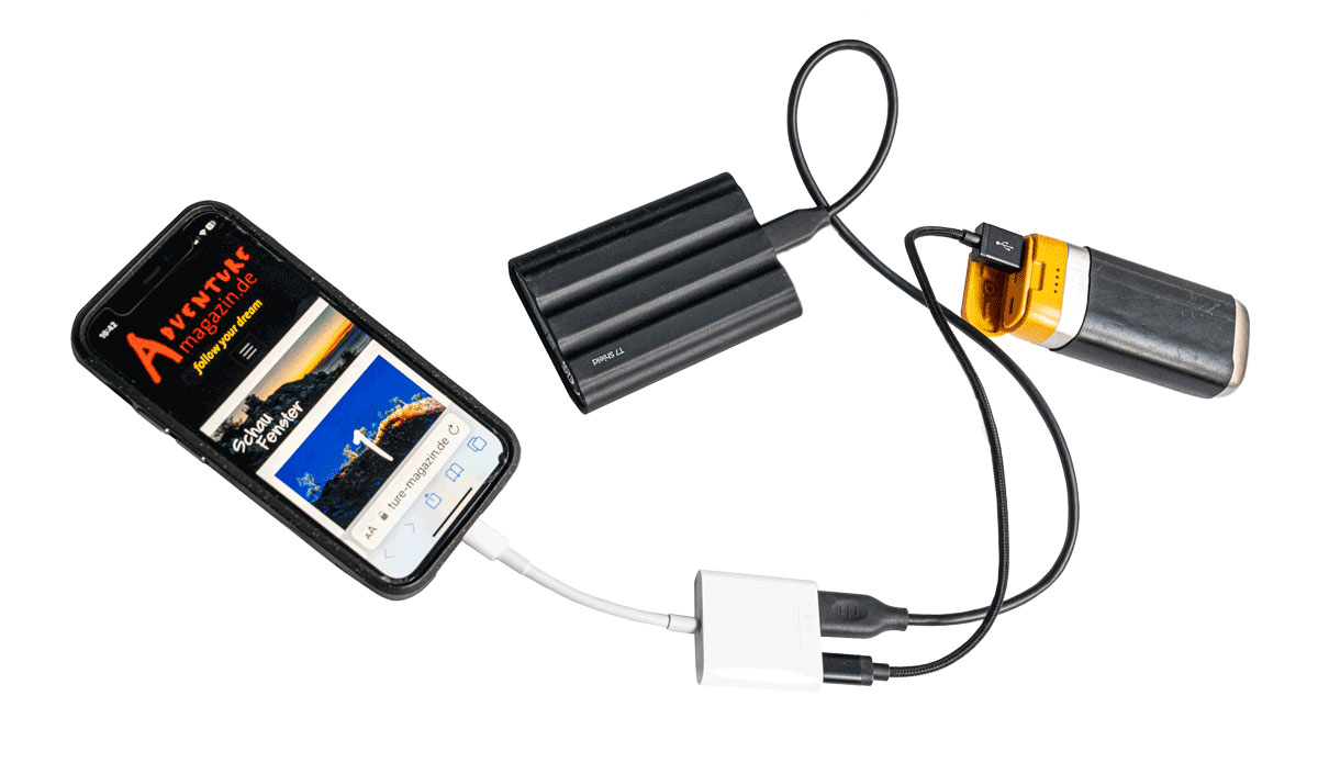 Die portable SSD T7 Shield mit 4 Terabyte Speicher von Samsung bietet hohe Schreib- und Lesegeschwindigkeiten von bis zu 1.050MB/s für USB 3.2 Gen 2 und ist IP65-zertifiziert. Zudem ist das Gehäuse aus Elastomer sehr griffig und kompakt (Kreditkartenformat). Die geringe Hitzeleitfähigkeit des gummierten Gehäuses sorgt zudem für gute Performance auch bei höheren Temperaturen. Zusätzlich kann die PSSD T7 Shield automatisch ihre Geschwindigkeit kontrollieren, um die Temperatur unter 60°C zu halten. Außerdem ist sie nicht nur mit PCs und Laptops kompatibel, sondern ebenso mit mobilen Geräten (Smartphone, Tablets), Spielekonsolen und auch Fernseh-Kameras. Ideal auch für Fotografinnen und Fotografen, die auf anspruchsvoller Tour keinen Laptop mitschleppen wollen. Wir haben die T7 Shield ans iPhone Mini via Lightning auf USB 3 Camera Adapter angedockt (siehe Bild ganz unten) und um die Stromversorgung kümmert sich eine kleine Powerbank.