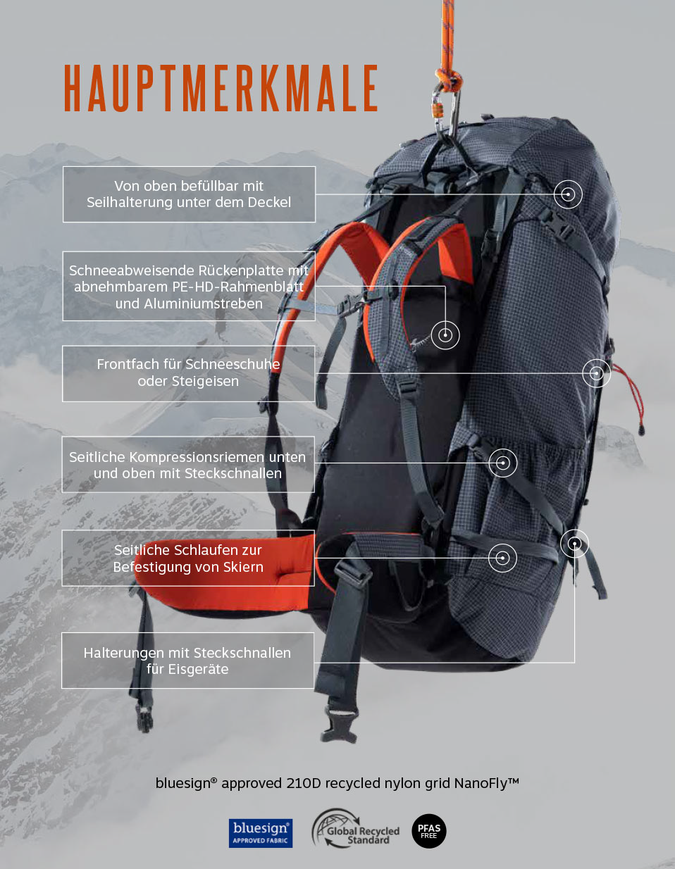 Gewicht: 1.0 kg; Abmessungen: 55 x 27 x 19 (H/B/T) in cm; Material: bluesign-zertifiziertes, 100% recyceltes Bird-Dobby-Nylon (210 den); PFAS-freie DWR-Imprägnierung. UVP: 140,00 €.