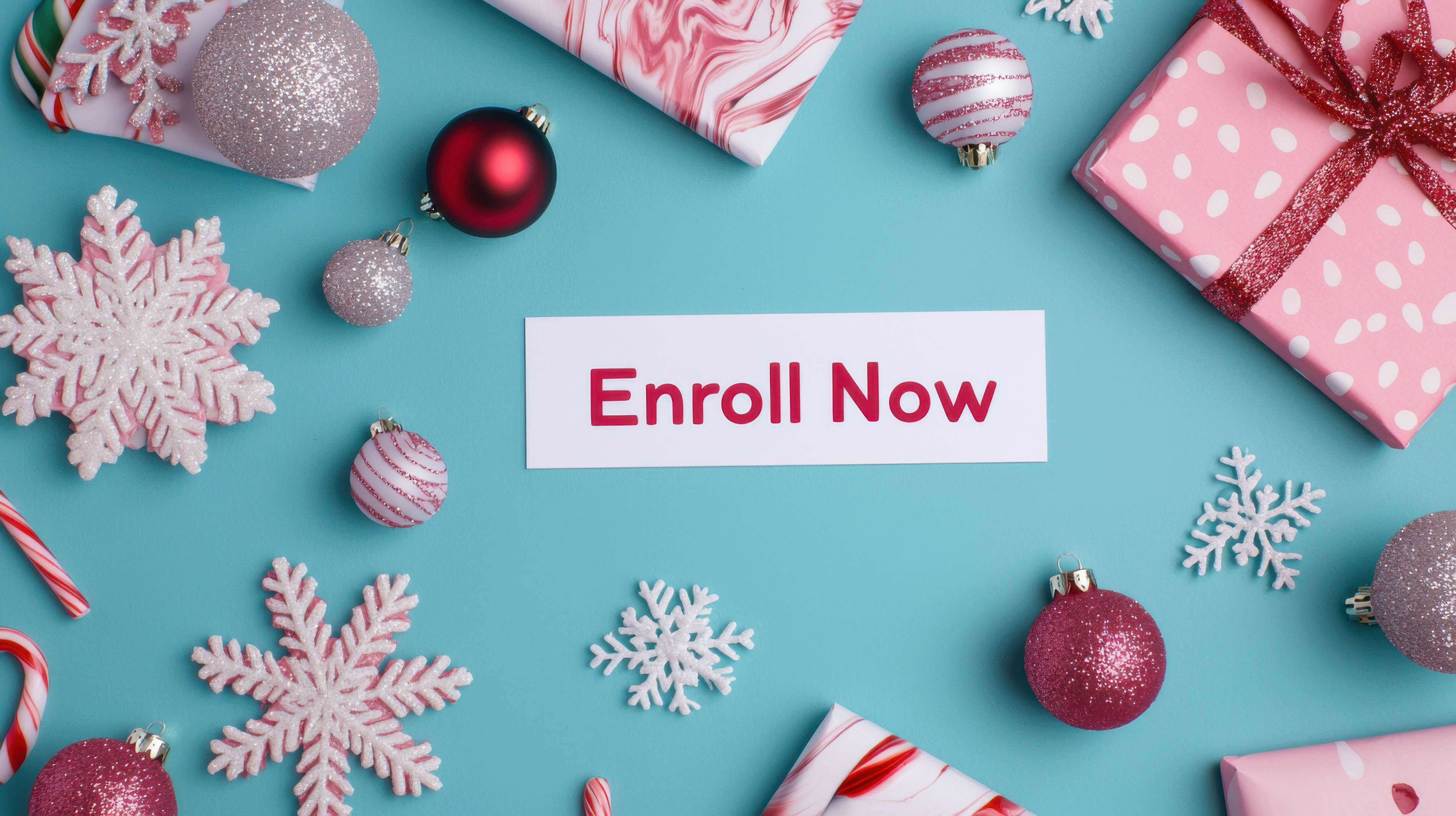 Created with images by justjupiter - "Christmas course, Colorful holiday decorations and gifts with a call to action to "Enroll Now" on a bright blue background." • Uuganbayar - "house in winter - heating system concept and cold snowy weather with model of a house wearing a knitted cap"