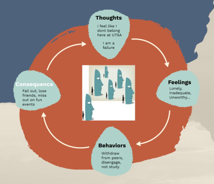 The next time you detect a negative thought, douse it with a coping strategy, like positive self-talk: I DO belong! Then sit back and let the cycle run. Positive thoughts will create positive feelings, which will bring about positive behaviors, which will lead to positive consequences. Bask in your new life until you start believing what was true all along: YOU ARE SUCCESSFUL! YOU ARE WORTHY! YOU DO BELONG AT UTSA!