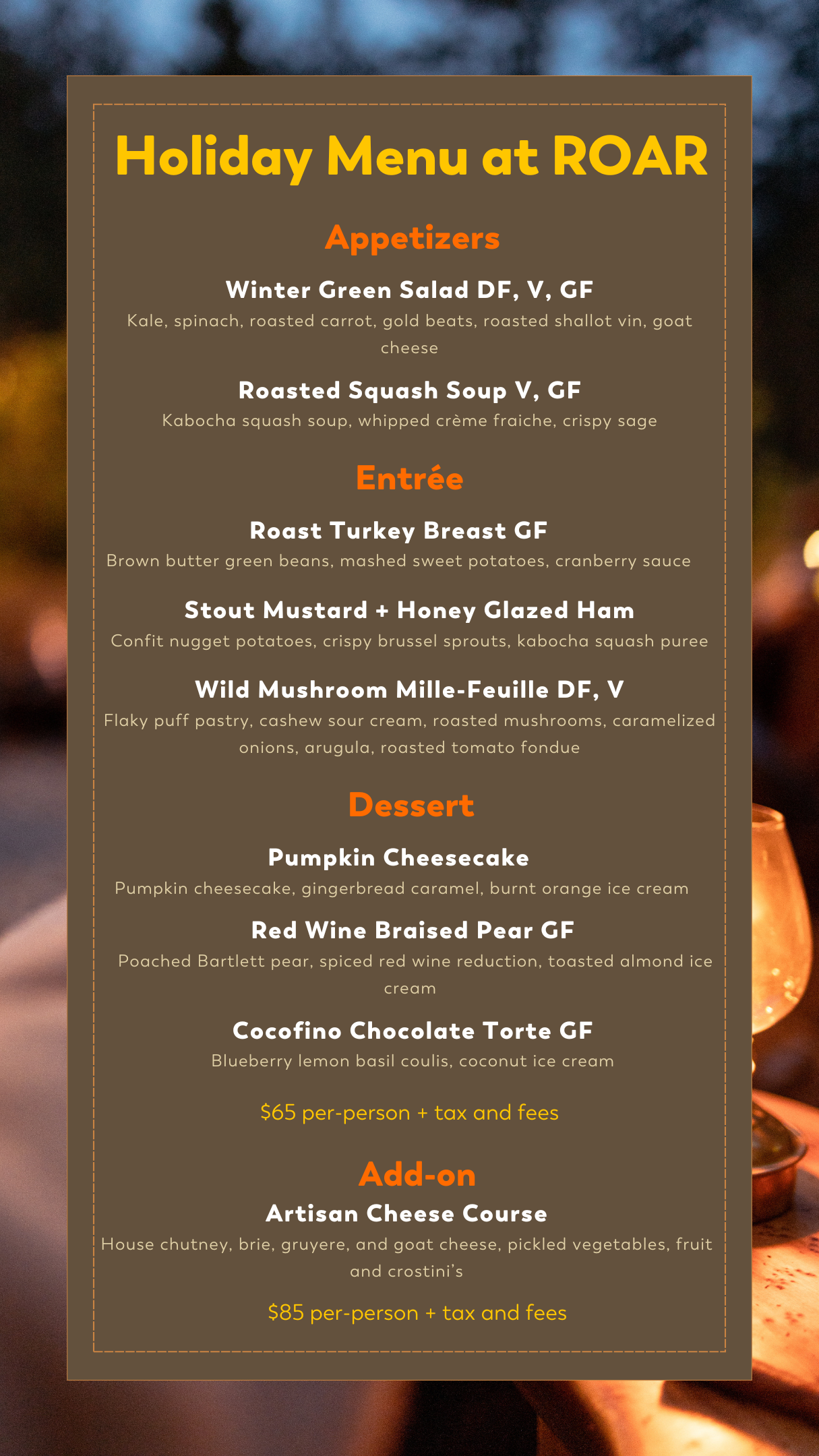 Get ready to ROAR into the holiday season with the perfect mix of West Coast charm and fiery flavours! Treat yourself to a three-course meal for only $65 per person, plus tax and service fees.