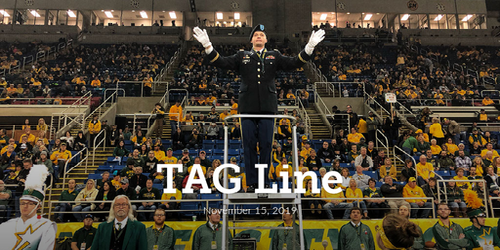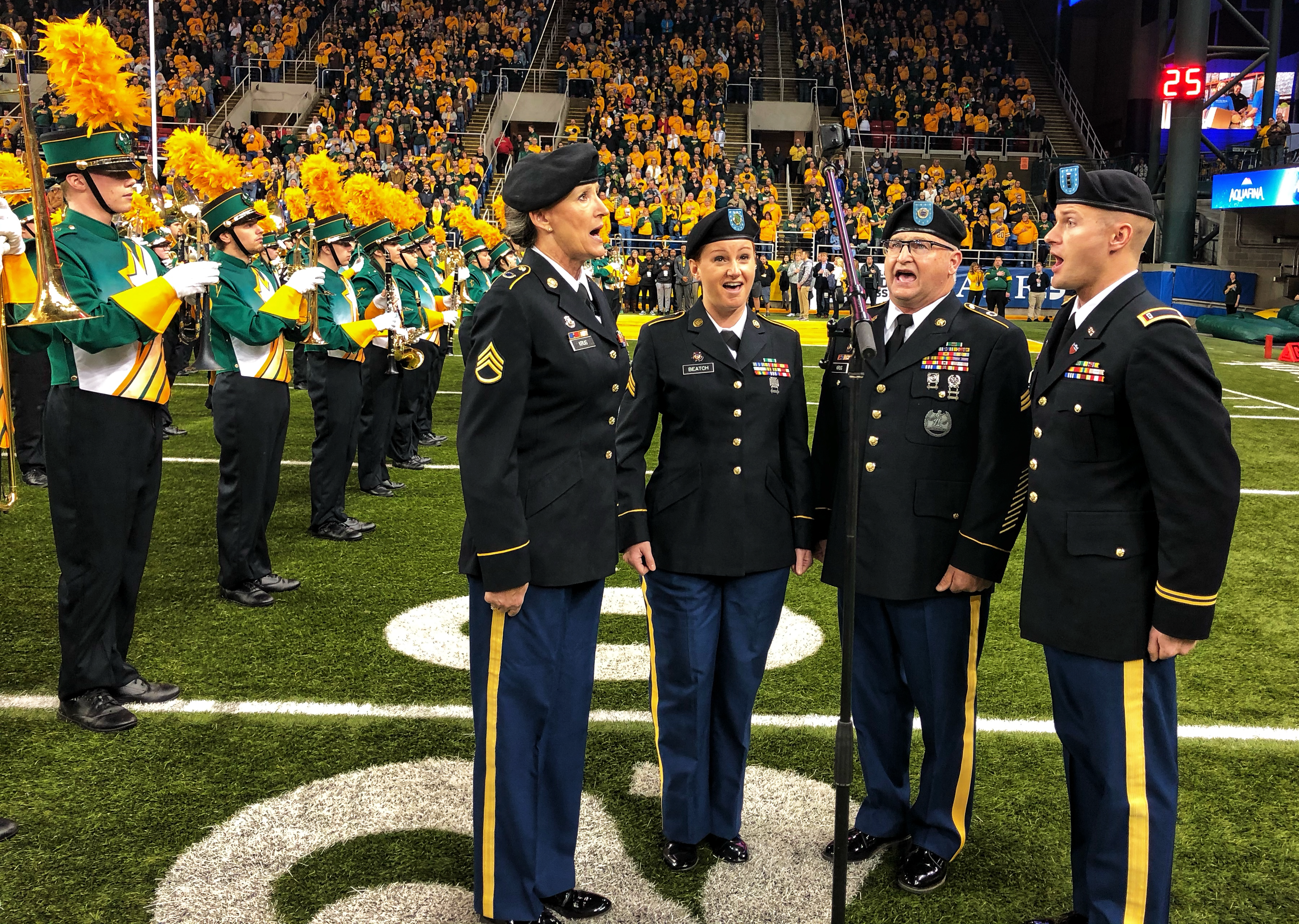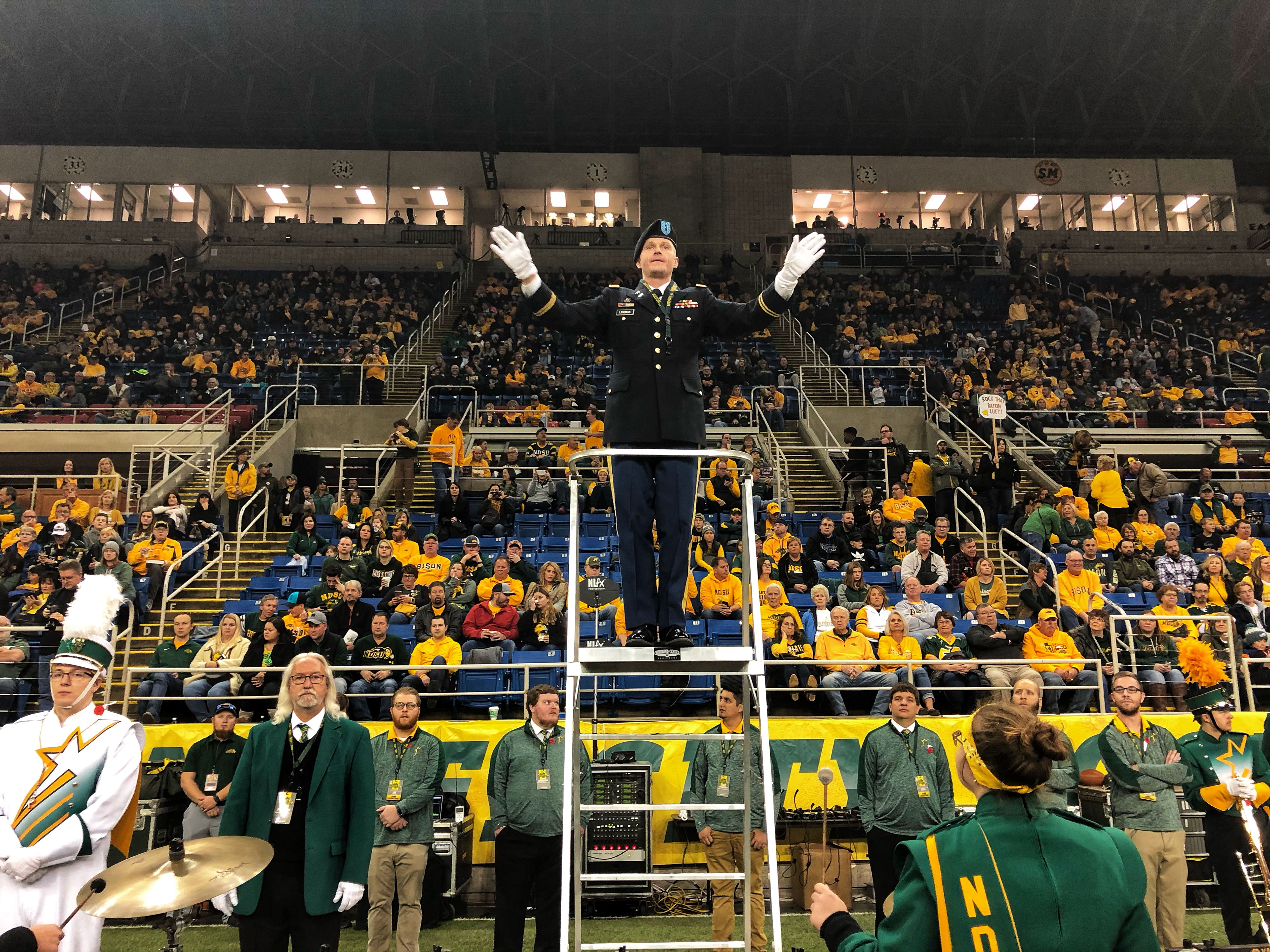 Soldiers from the N.D. National Guard's Fargo-based 188th Army Band supported the military appreciation football game between the North Dakota State University (NDSU) Bison and the Western Illinois Leathernecks on Nov.9 at the Fargodome. Four Soldiers sang the national anthem while the band's commander, Chief Warrant Officer 2 James Landman, served as guest conductor with the NDSU Gold Star Marching Band during halftime festivities. Top photo: Guest conductor Landman leads the Gold Star Marching Band in a musical selection at halftime.