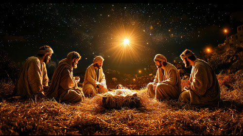 Created with an image by MP_Artworks - "An illustration depicting shepherds kneeling reverently before the newborn Jesus in the manger, with the radiant Star of Bethlehem illuminating the scene, creating a serene and sacred atmosphere."