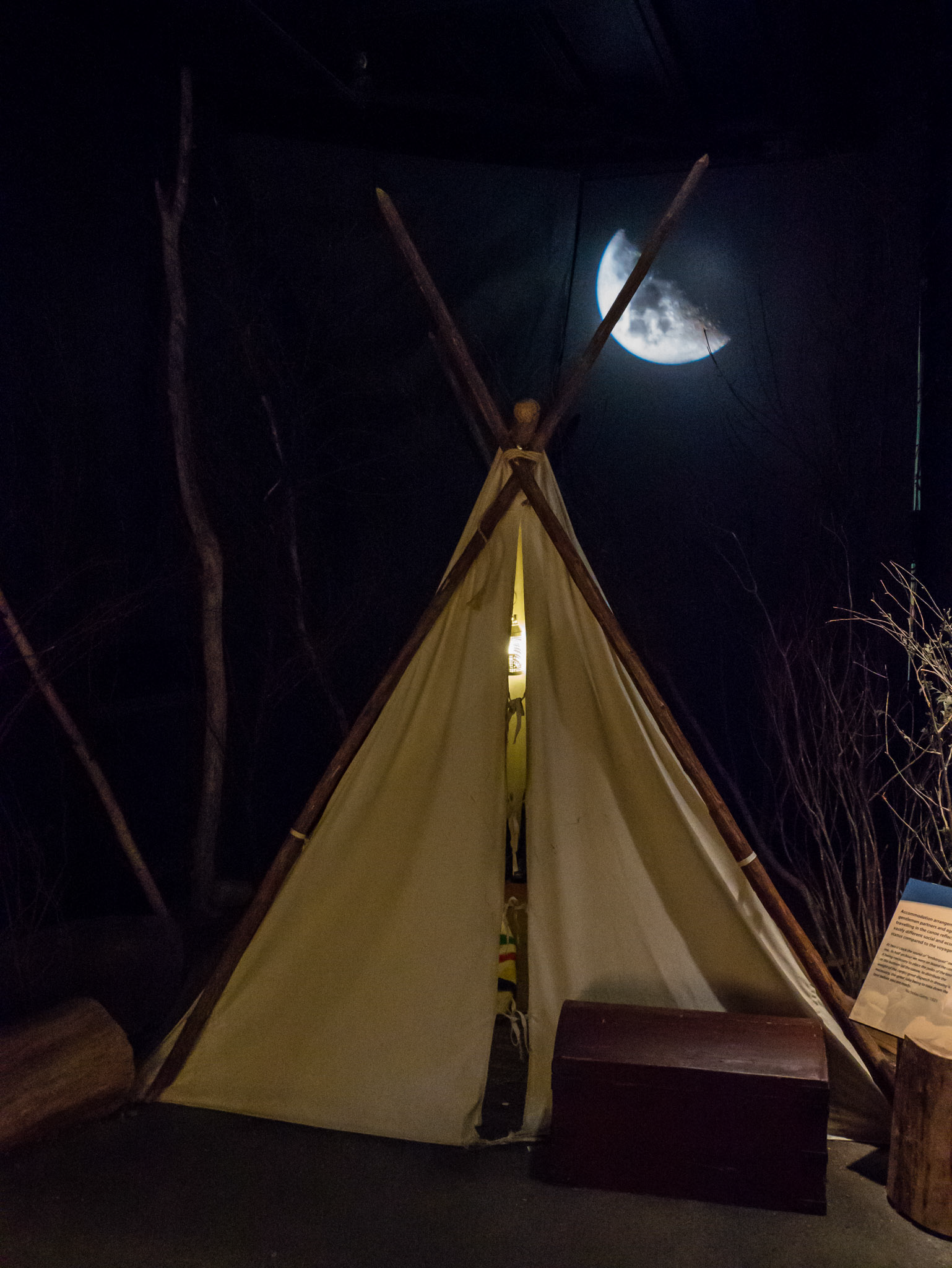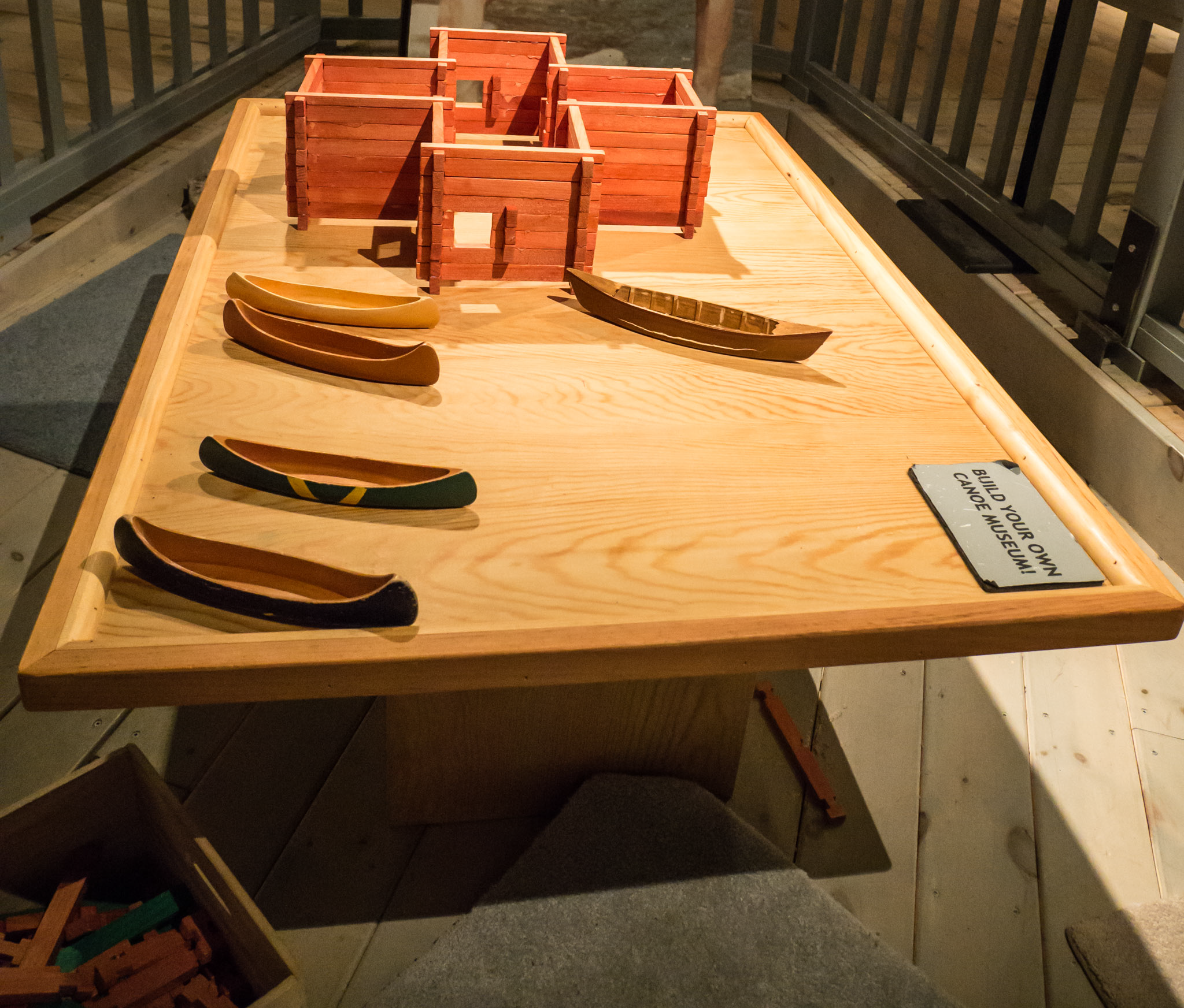 There are lots of areas for the kids to do things; build their own museum, make a paper canoe, even pretend to be a voyageur camping by the shore!