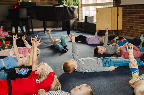 Og her er det billeder fra onsdag den 25. september, hvor 0. og 1. årgang havde 'Musik på tværs'. Timen består af sang og dans og afsluttes som regel med en rolig stund, hvor børnene slapper af på gulvet med fokus på vejrtrækning og at mærke deres egen krop.