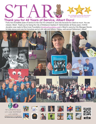 Forty-two incredible years of service to the City! It’s unheard of, and only because he cared so much. You are missed, Albert. Thank you for being the City of Brisbane’s fearless IT Administrator all these years. A $150 donation was made to Nine Lives Foundation in Albert’s name to help rescue and care for homeless and at-risk cats and kittens. Happy, well-earned Retirement, Albert! See more photos of Albert on the cover of the April STAR.