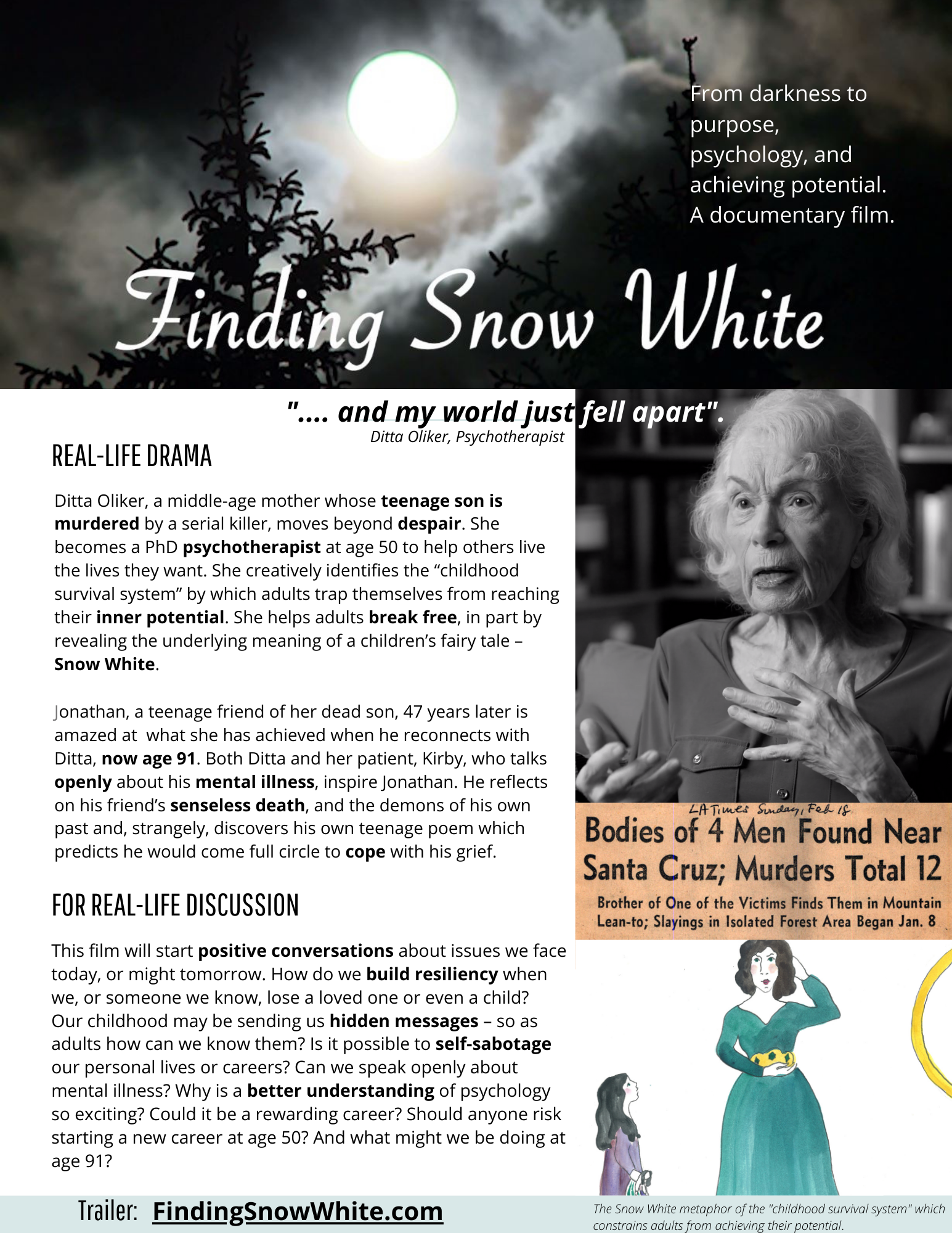 In this uplifting story, people transform past tragedy and adversity into wellness and hope. After 47 years, Jonathan reconnects with Ditta Oliker the mother of his boyhood friend David, who was victim of a mass murder in the Santa Cruz mountains in 1973. Jonathan finds Ditta had emerged from that tragedy to become a psychotherapist and author, creatively achieving insight to help people break free of their past to achieve their inner potential. Ditta and a former patient, Kirby, a Broadway actor, reveal how a "childhood survival system" confines adults to past relationships even without their conscious knowledge. To explain it, Ditta interprets the Snow White story as a metaphor of human psychology, and Kirby tells his personal story of breaking free. They inspire Jonathan to reassess the alienation which drove him as a teenager and see a bigger picture. Also, while visiting Ditta, Jonathan discovers he left a poem he wrote as a teenager among his friend’s papers. It strangely foretold Jonathan would come full circle many years later, to cope with what happened.