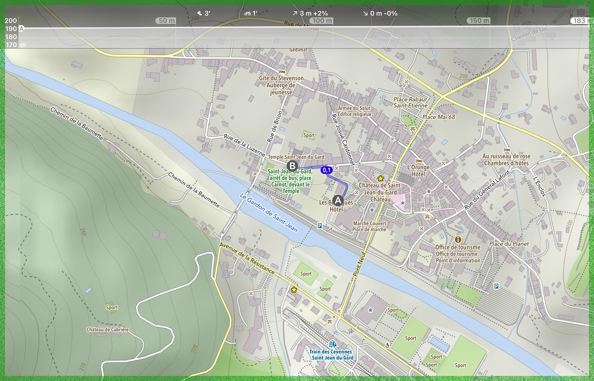 Trajet prévu et effectif : Saint-Jean-du-Gard, de l’hébergement au bus, 183 m ! Nous ne sommes même pas trompées pour rejoindre la place Augustine Soubeiran.