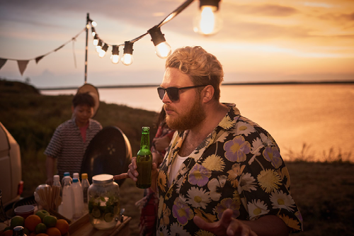 That’s the attitude for an outdoor summer beach party! Laid back, enjoying yourself, and with a drink in your hand. I can see that guy moving his shoulders, following the beat of the music, and saying hello to everyone with just a nod of his head... The image and attitude are so real! It looks like a candid, real moment and not something staged. Authenticity is a key point for this kind of images so they can connect with the audience.