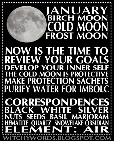 January is also a great time to work on full moon magic - after all, the nights are long and dark, and in some areas the moon itself is the only source of light. Put aside your lethargy, and focus some energy on developing your intuition and wisdom.