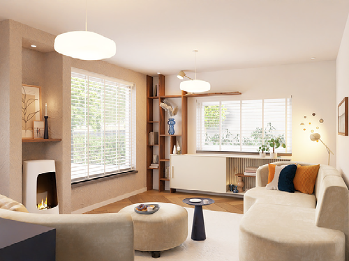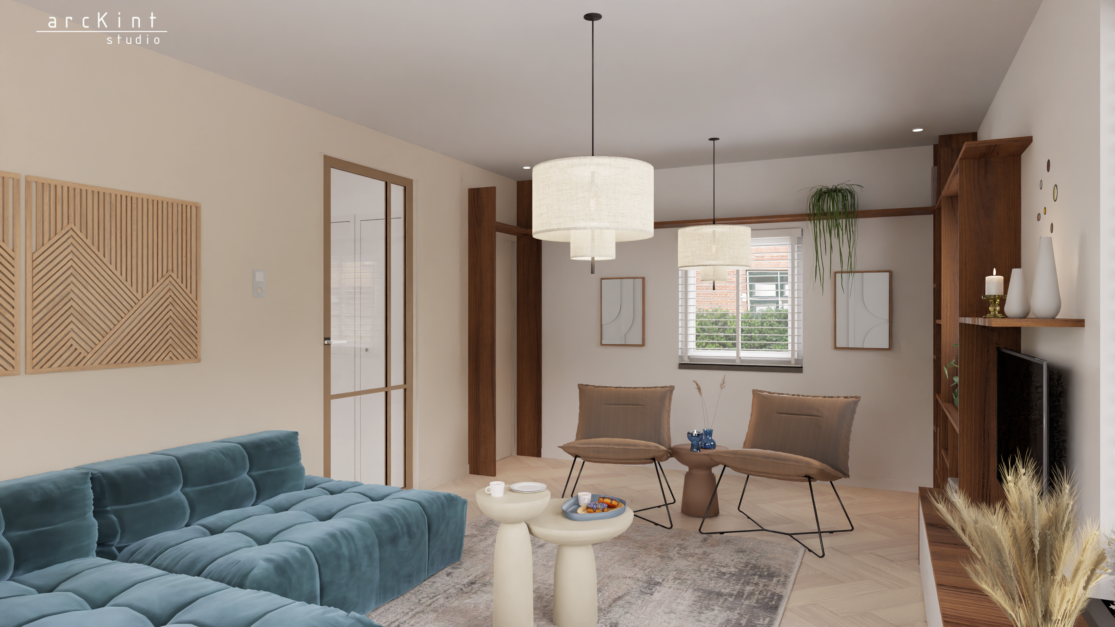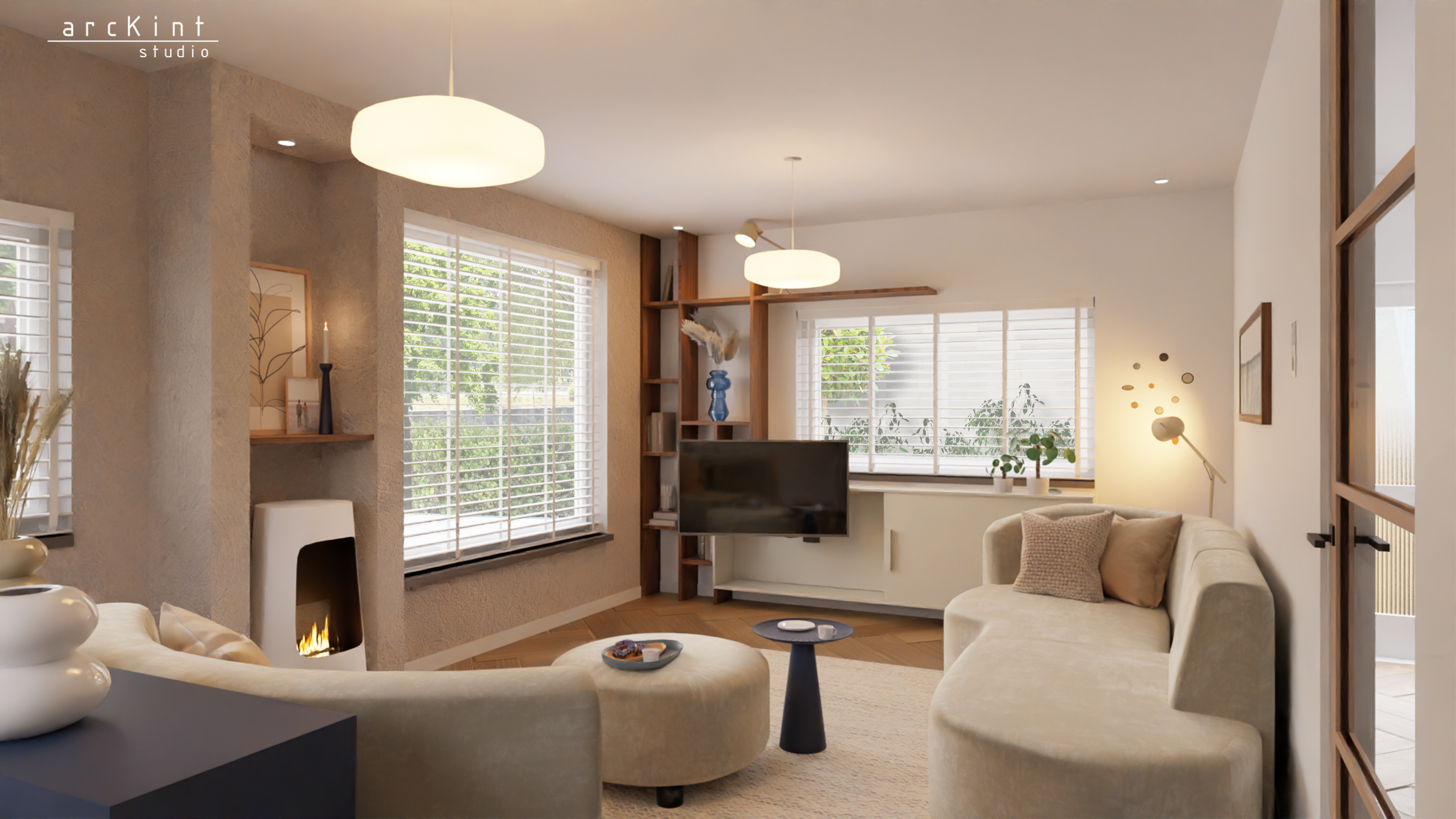 Met de wens om het uitzicht op de voortuin te behouden, heb ik voorgesteld om de bank tegenover het raam te plaatsen, waar oorspronkelijk een dressoir met de televisie stond.