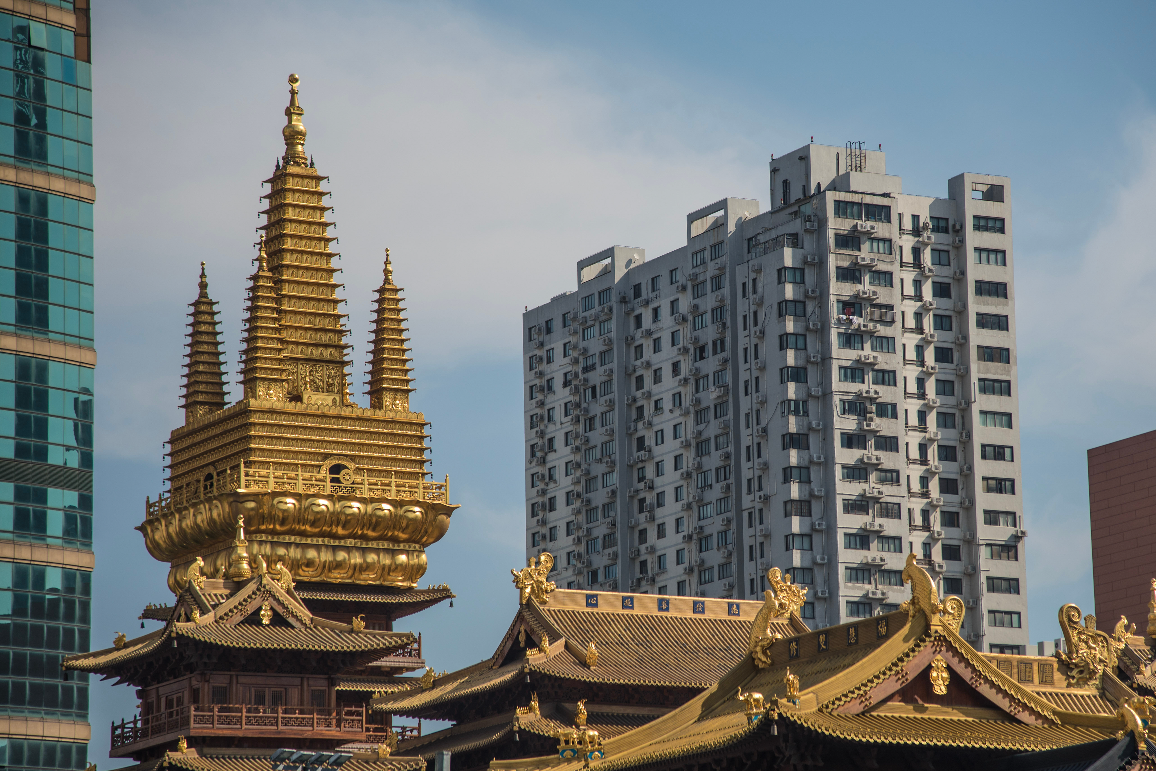The image on the left is of the Jing'an Temple in Shanghai. This temple was first seen at the Jing'an site in 1216 during the Song dynasty. It has seen much renovation and at one point was even a factory. The temple was reestablished under Buddhist tradition by Master Chisong in 1953. This historic temple is seen in an urban setting, creating a juxtaposition between the past and present.