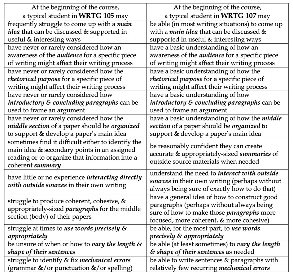I requested WRTG 107, but I got placed in WRTG 105. Is there anything I can do? Your request was considered by your advisor, then one or more of our full-time FYW instructors assessed your placement exam and determined that you would be more successful in our 2 semester 105/106 course. In WRTG 105/106 you will earn 6 credits instead of 3. Please be assured that we felt this placement would help you to be the most successful in FYW and at the university.