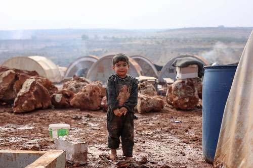 A Little Boy Standing in the Mud at a Refugee Campsite. photo by Ahmed Akacha