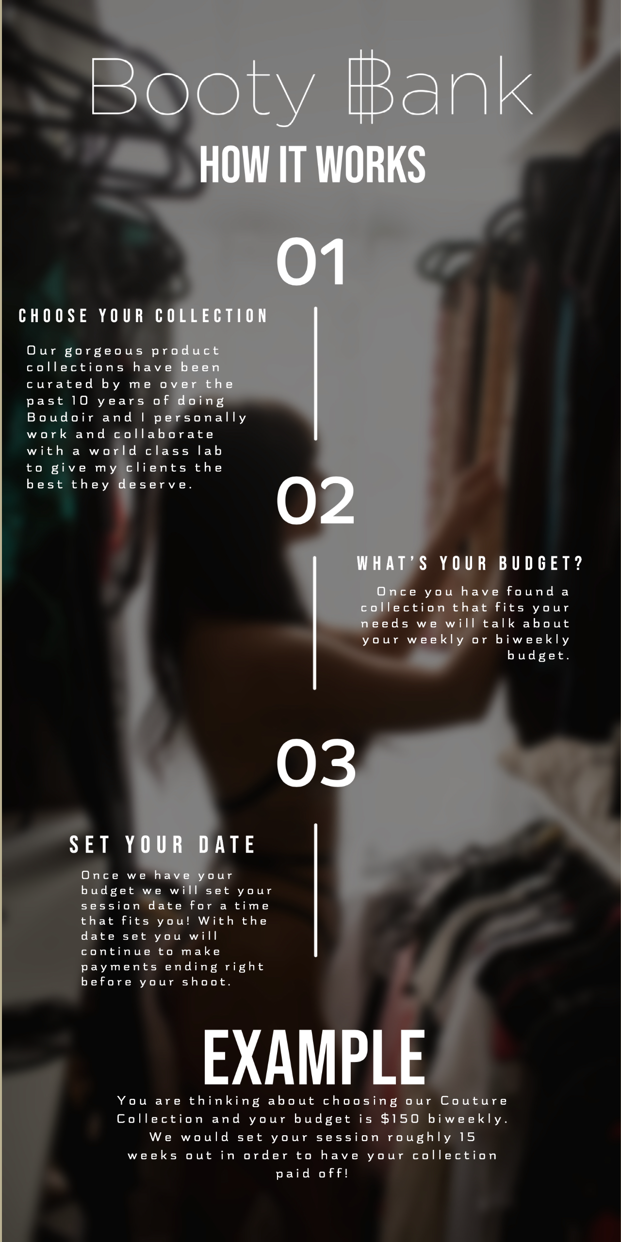 OC+Boudoir Booty Bank is an amazing in-house prepayment plan that allows clients to set their own budget. So no matter if you can afford $100 every two weeks or $400 we will set a payment plan that will work best for YOU!