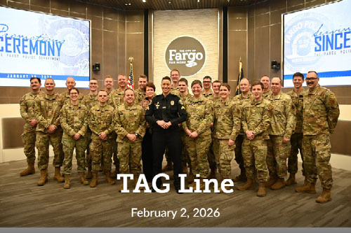 U.S. Air Force Master Sgt. Lacey Bunkelman, 119th Wing, was named the Fargo Police Department’s 2025 Officer of the Year takes a group photo during a ceremony Jan. 26 at Fargo City Hall. (U.S. Air Force National Guard photos by Senior Master Sgt. Michael Knodle, 119th Wing Public Affairs)
