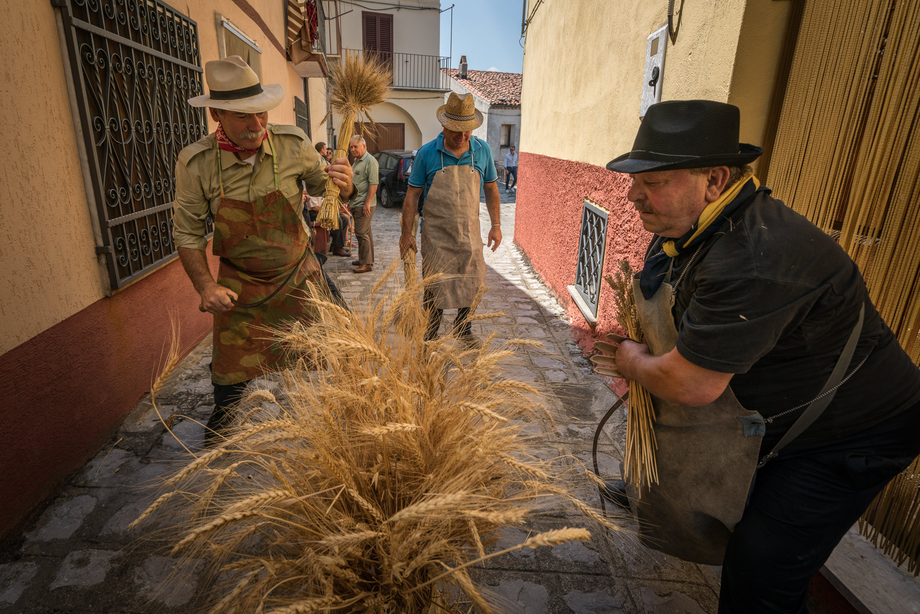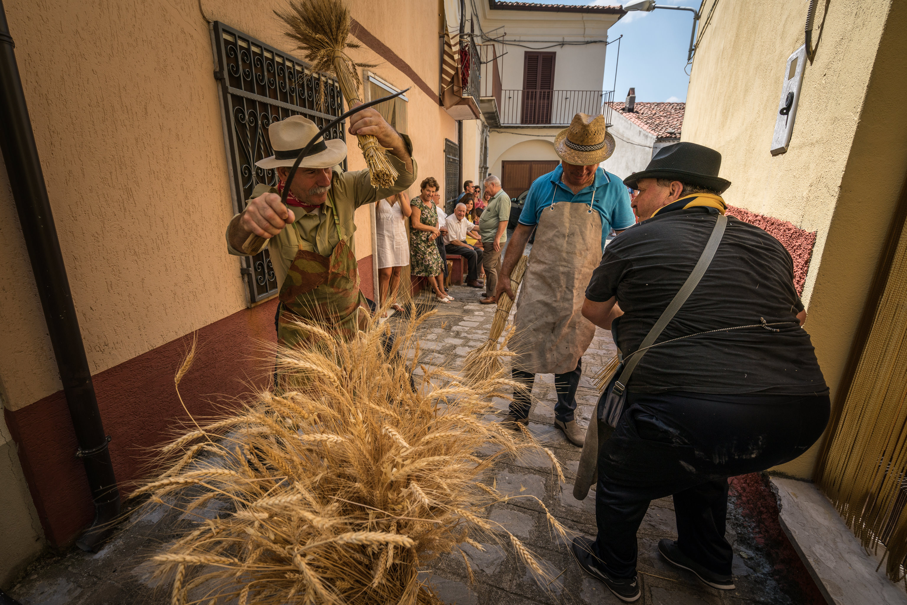 In this photo essay I start from the evident decline of agricultural ways of life for people in this part of Basilicata. Once flourishing rural settlements are now becoming depopulated, the land dedicated to farming is significantly reduced compared with even the 1960s years ago, and rural ways of life are not as central anymore to most people. Yet, since the early 2000s, we have witnessed a revival of events involving wheat, including both religious festivals and events celebrating agricultural heritage.The politics of intangible heritage play a factor in this renewed attention dedicated to wheat festivals, but we have also noticed the strong emotional power of their association with the agricultural past.These emotional reactions are not confined to the moment of the festival itself: they are also at play in the preparatory phases of the event, which often involve activities, skills and sensations that directly evoke the agricultural past. The photographs that make up this photo essay follow a realist documentary style that is rooted in the history of anthropology in Basilicata. In combination with the accompanying texts and sounds, the aim of these images is to evoke the manner in which, with varying degrees of consciousness, people in contemporary Basilicata perform cultural heritage at the same time as performing acts of religious devotion.
