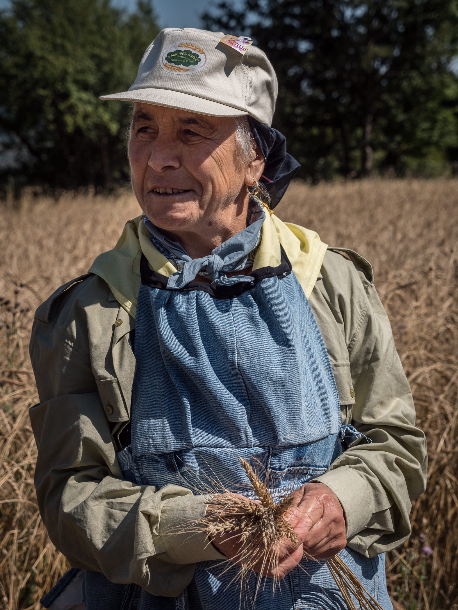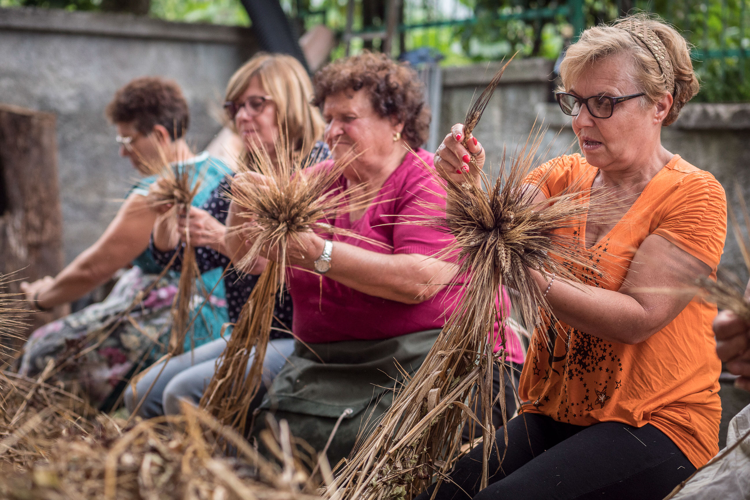 The participants come from villages surrounding the area, and have different agendas. For the organisers, there is clear desire to spectacularise the event, turning a practice of the old rural lifeworld into a show that includes live commentary, traditional music, and branded aprons and banners, plus an audience confined to a designated area. Some of the participants have not necessarily experienced manual reaping in their lifetime, while others, visibly older, clearly take part as an opportunity to experience again the actions that they associate with their past. In 2018 it was striking to see teams made up of older men and women go about their work in a way that was not competitive at all – in fact they would not even try to catch up with the faster teams. The impression was that for them the competition was a moment to be savoured, dense in affective significance, and a way to experience actions, sounds and other perceptions that connect directly with the past. Behind one of these teams was an old lady who gleaned stray ears of wheat, saving them for an upcoming religious festival.