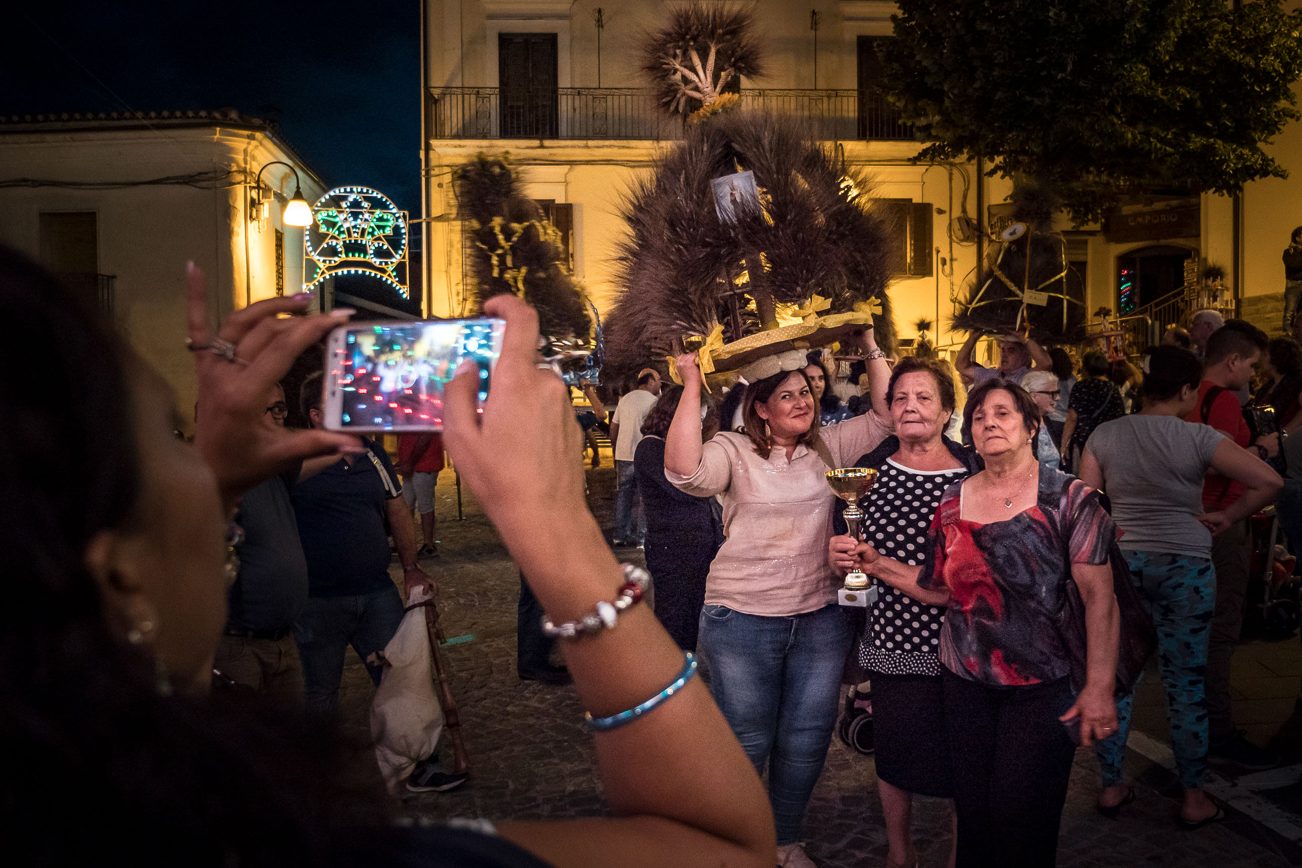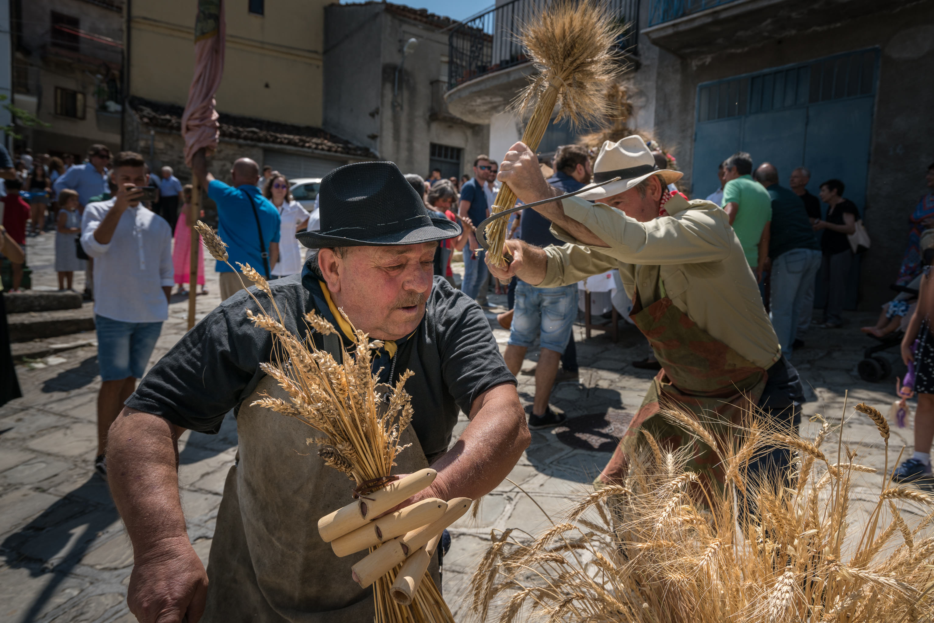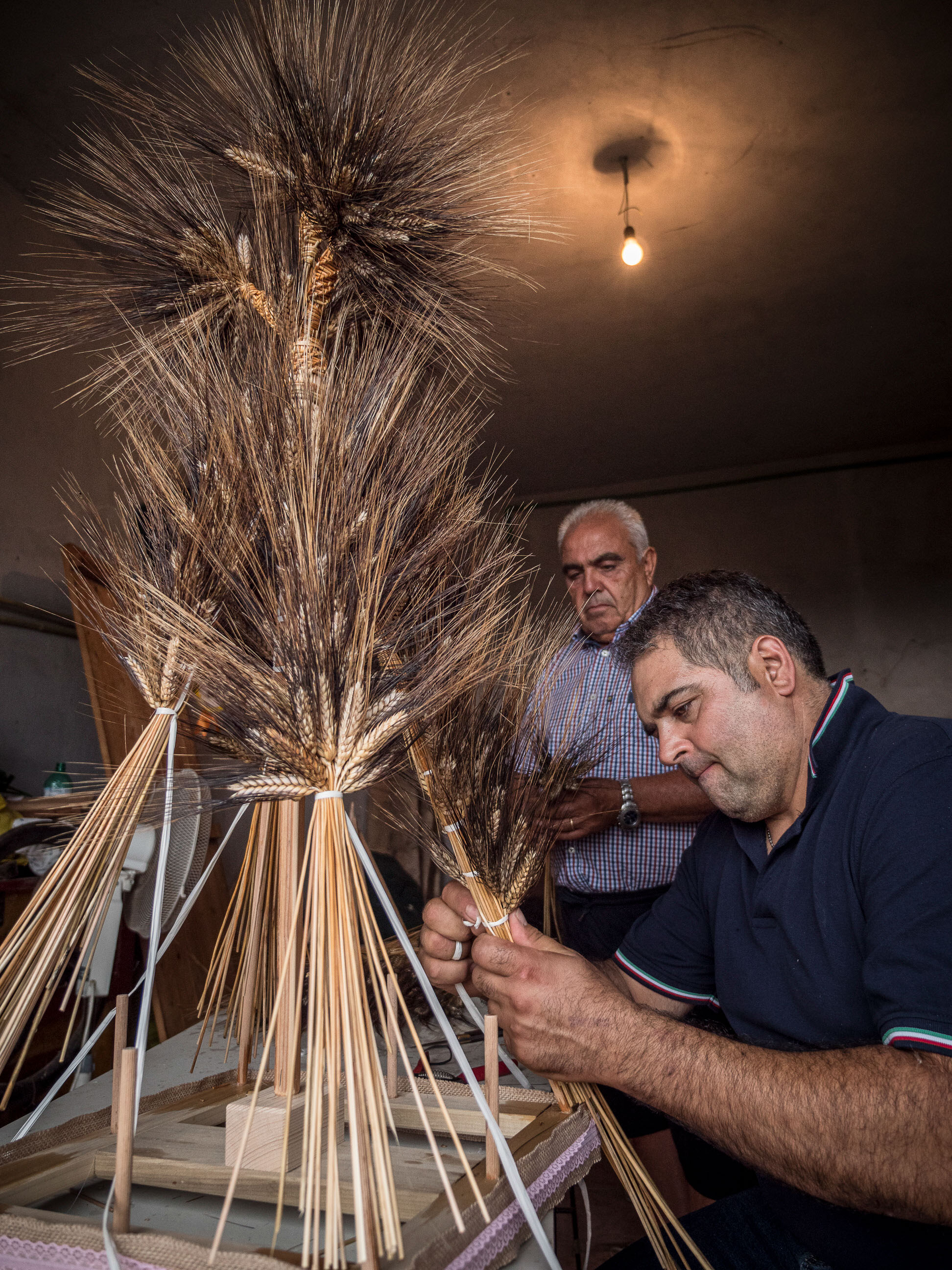 Procuring wheat with long stalks that can be tied to the frames that make up the offerings used in wheat festivals is a constant problem for people involved in their organisation, since the mechanisation of agriculture produces an unsuitable harvest.The wheat has to be reaped manually, and the preferred variety – called Senatore Cappelli – has widely been replaced by more modern hybrid seeds with a higher yield per hectare. The ears of Cappelli wheat have a different shade of gold to them, with darker streaks. Most of the makers of offerings we spoke to said that they prefer Cappelli wheat because its visual appearance is more mindful of the days of old, thus confirming that they are enacting a vision of tradition that is based on precise details from the past.