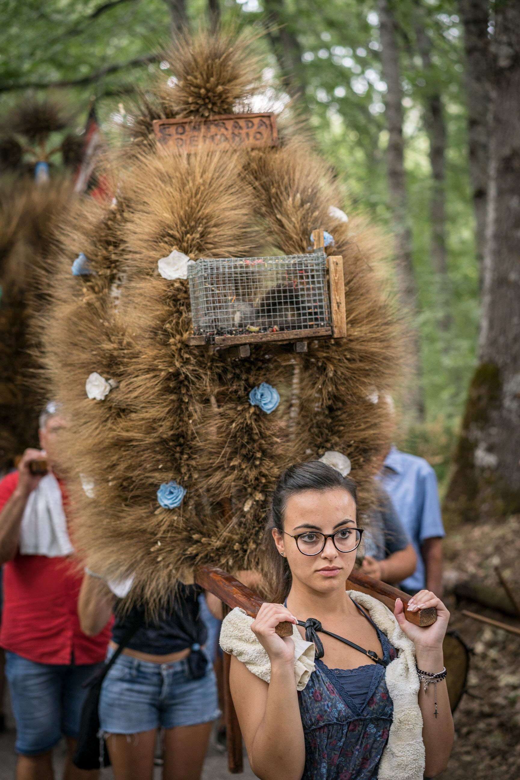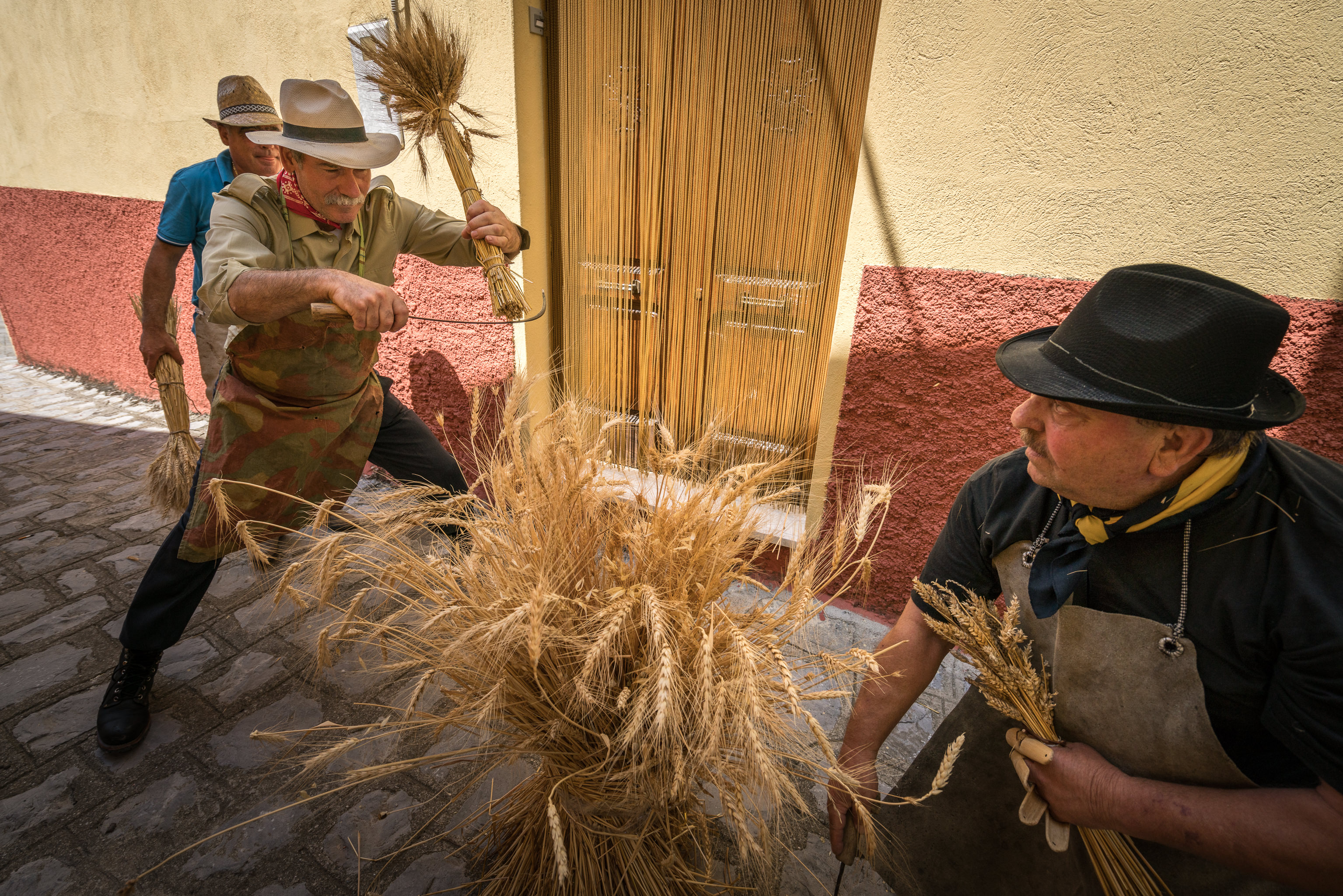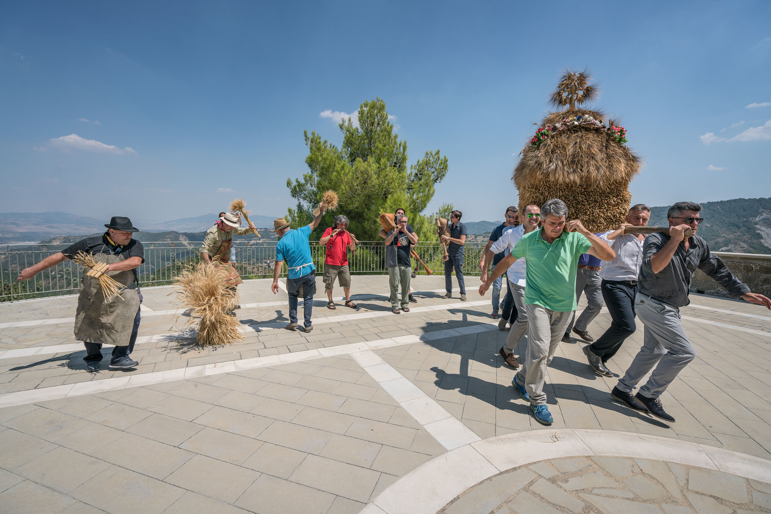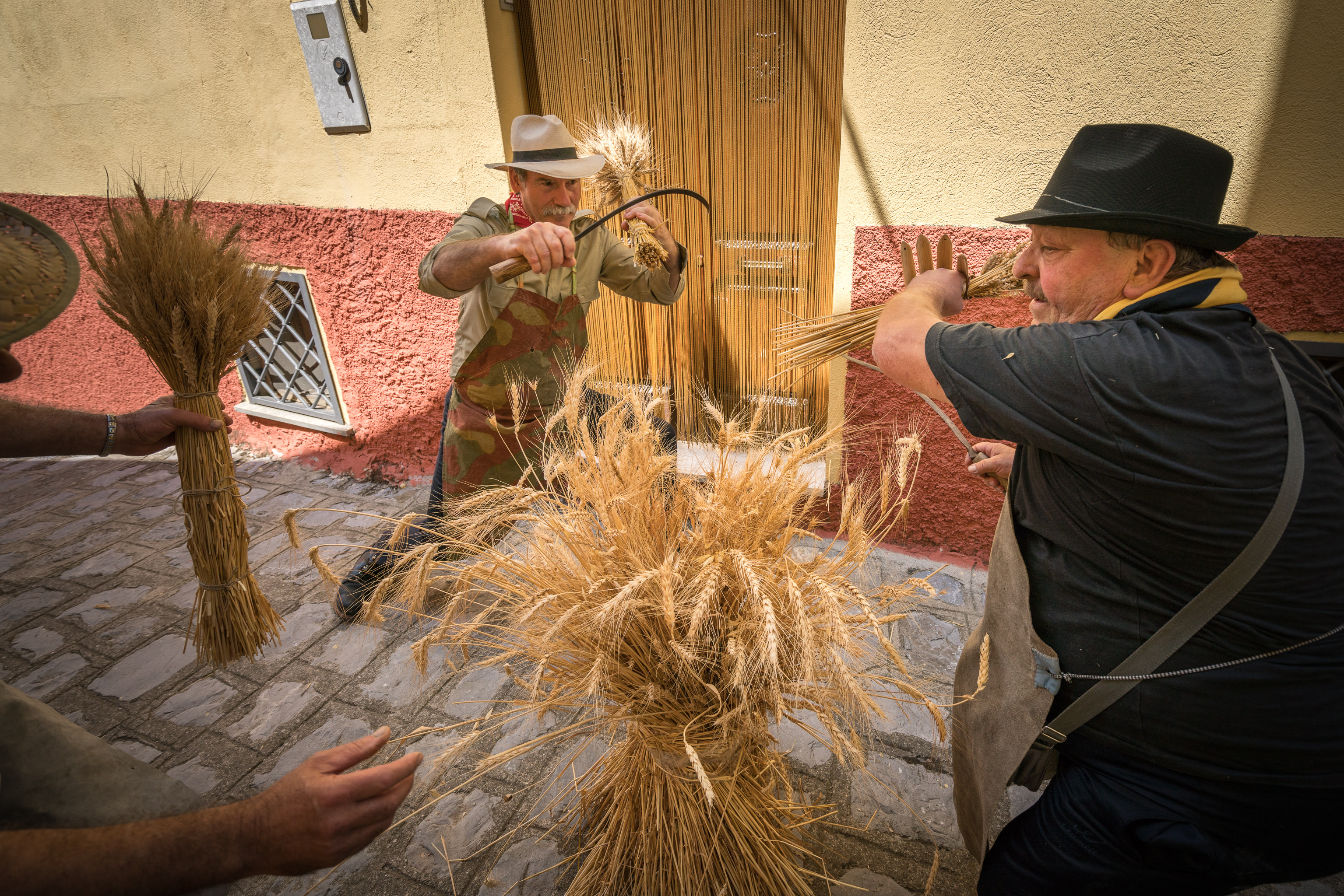 Procuring wheat with long stalks that can be tied to the frames that make up the offerings used in wheat festivals is a constant problem for people involved in their organisation, since the mechanisation of agriculture produces an unsuitable harvest.The wheat has to be reaped manually, and the preferred variety – called Senatore Cappelli – has widely been replaced by more modern hybrid seeds with a higher yield per hectare. The ears of Cappelli wheat have a different shade of gold to them, with darker streaks. Most of the makers of offerings we spoke to said that they prefer Cappelli wheat because its visual appearance is more mindful of the days of old, thus confirming that they are enacting a vision of tradition that is based on precise details from the past.
