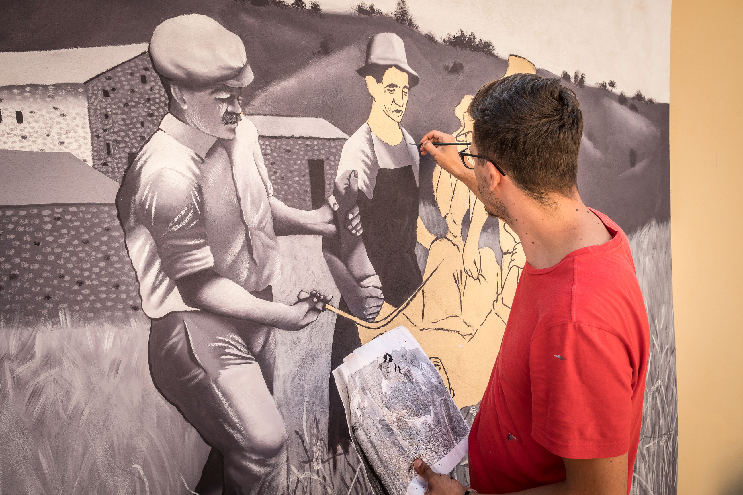 Sixty years after De Martino, wheat festivals have assumed an important role in San Giorgio Lucano’s strategy to attract regional funding in support of intangible heritage. Much of the case for support is based on De Martino’s interpretation of the game of the sickle. Traces of this ritual are visible in San Giorgio in the form of posters, theatre pieces, re-enactments and other forms of public art that include mural paintings along the streets. Franco Pinna’s black and white images are an important part of this process of appropriation of a practice that disappeared during the 1950s, and are seen in most of these occasions (see chapter 7). In San Giorgio the folklorisation of wheat festivals is perhaps most evident during the processions of the day of St Roch, when children are dressed up in generic ‘peasant’ costumes that can be seen in a variety of festivals across the region, and are made to parade with small bundles of wheat or miniature versions of the larger offerings.