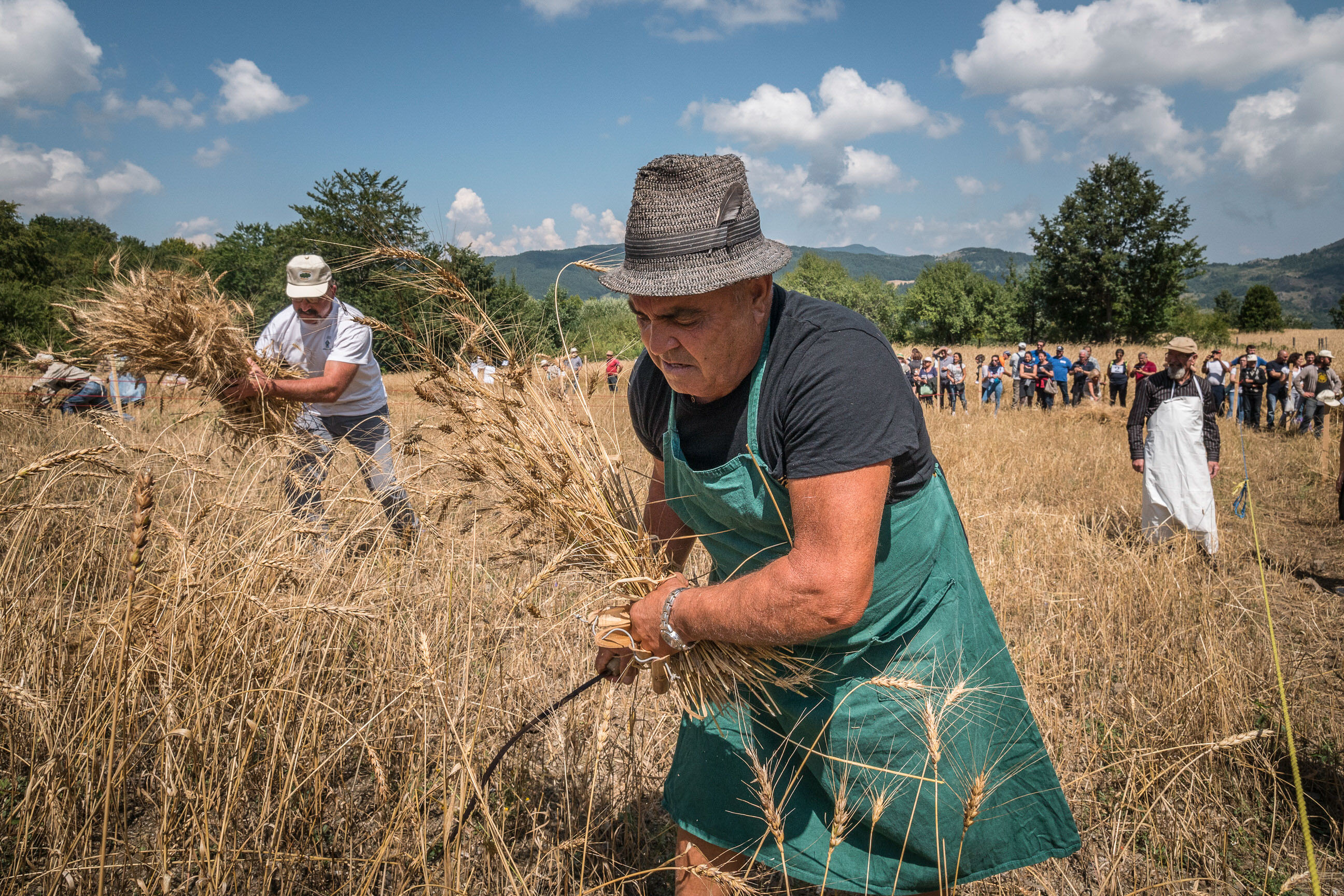 In Terranova di Pollino a holiday farm, with the support of the local tourist office, has devised a way to provide the right type of wheat and promote local produce and ways of life by setting up a manual reaping competition. The format of the event was imported from neighbouring region Campania: teams of reapers are assigned a strip of wheat field each and compete in speed, so that those who complete the harvest first receive a prize.At 1500m above sea level the wheat is ready for harvest much later than at lower altitudes, so the event can take place in early August, when the presence of tourists is at its peak.