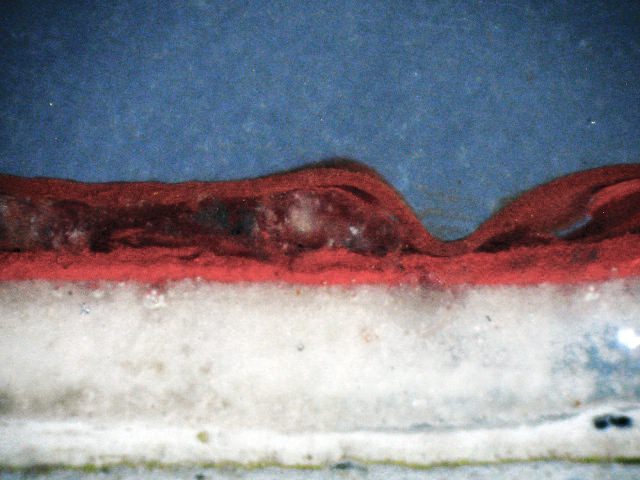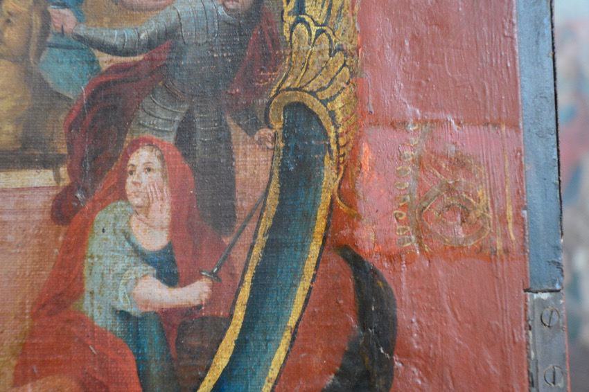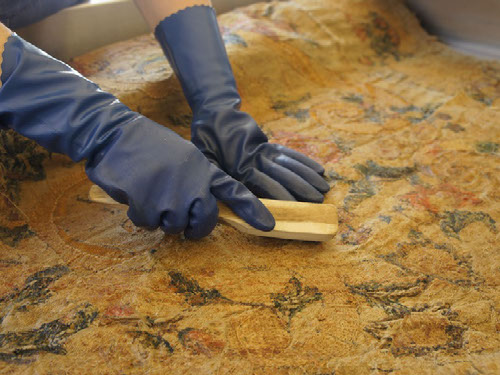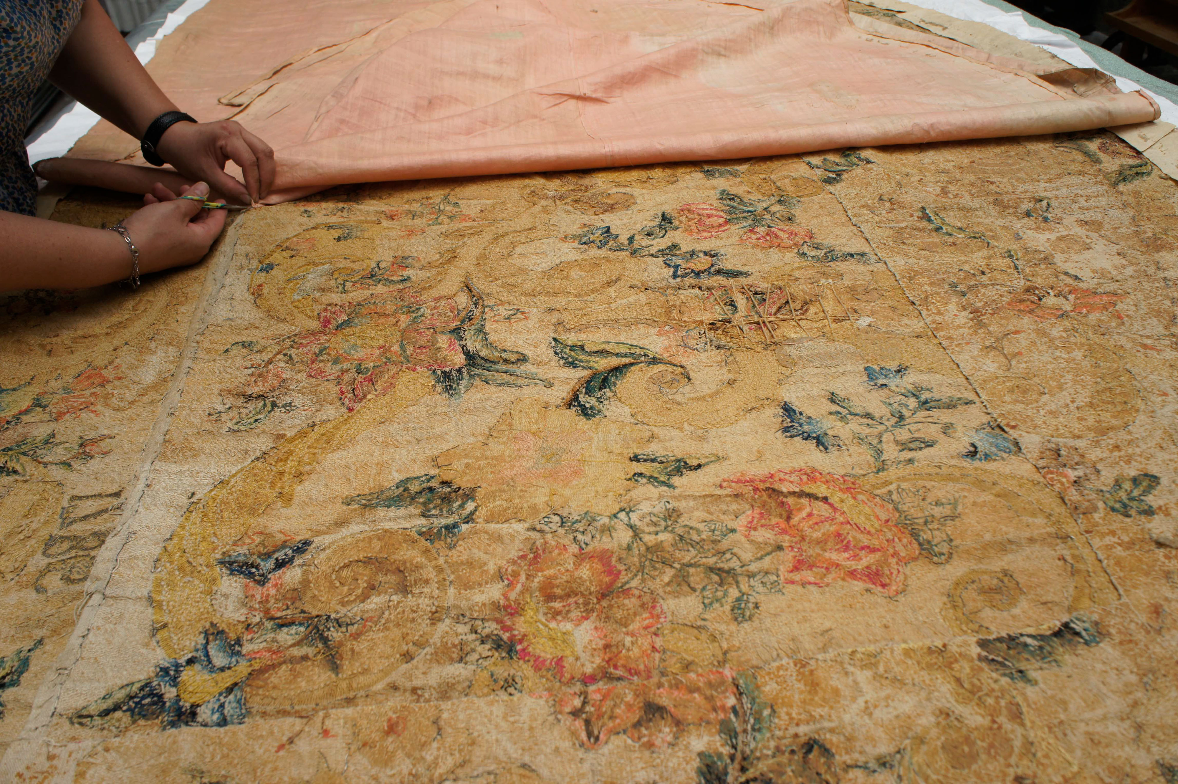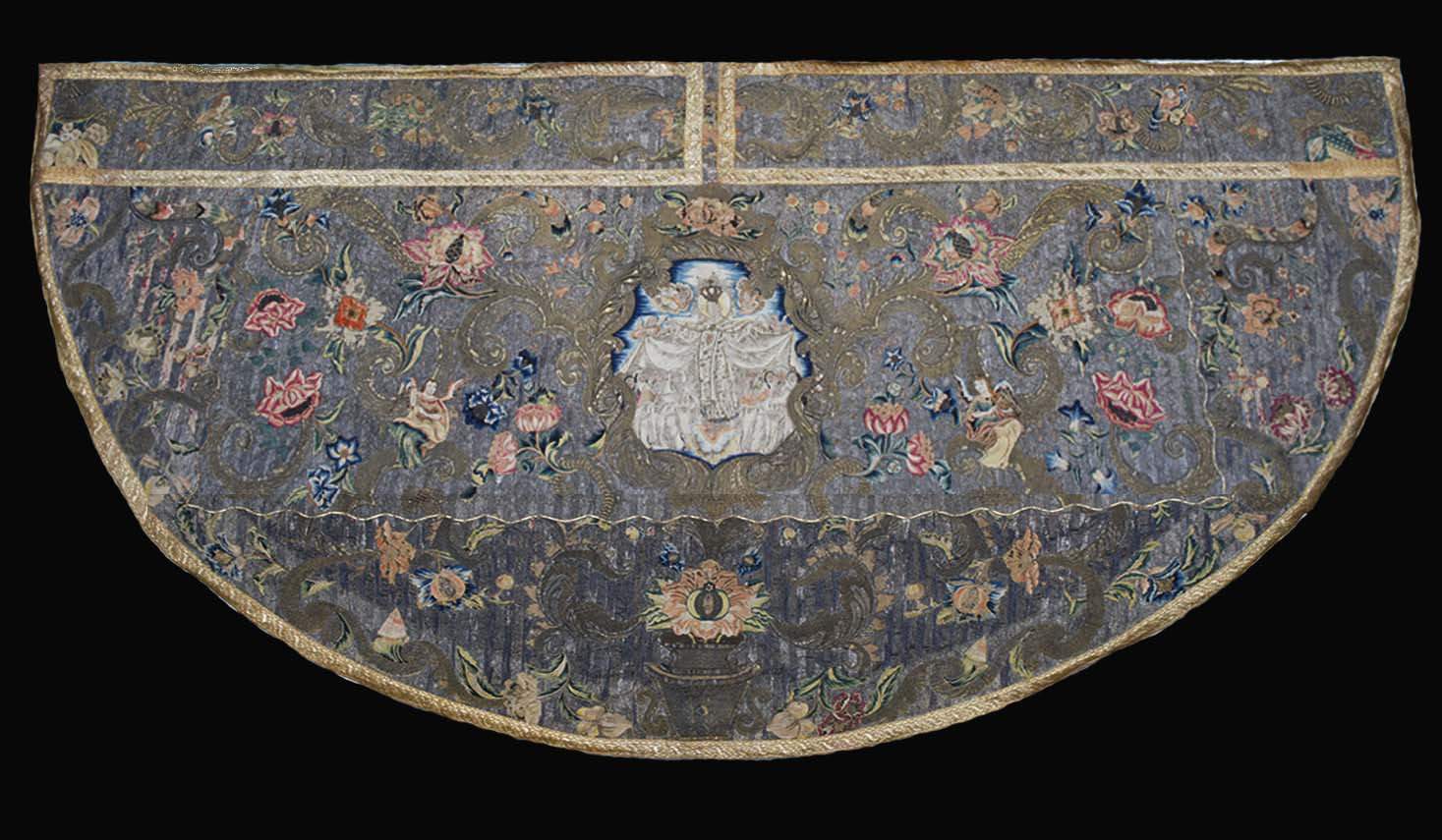 Durante la restauración de la capa pluvial, fue posible identificar un recubrimiento al reverso del lienzo que posiblemente corresponde a un apresto o encolante orgánico que refuerza las puntadas del bordado.