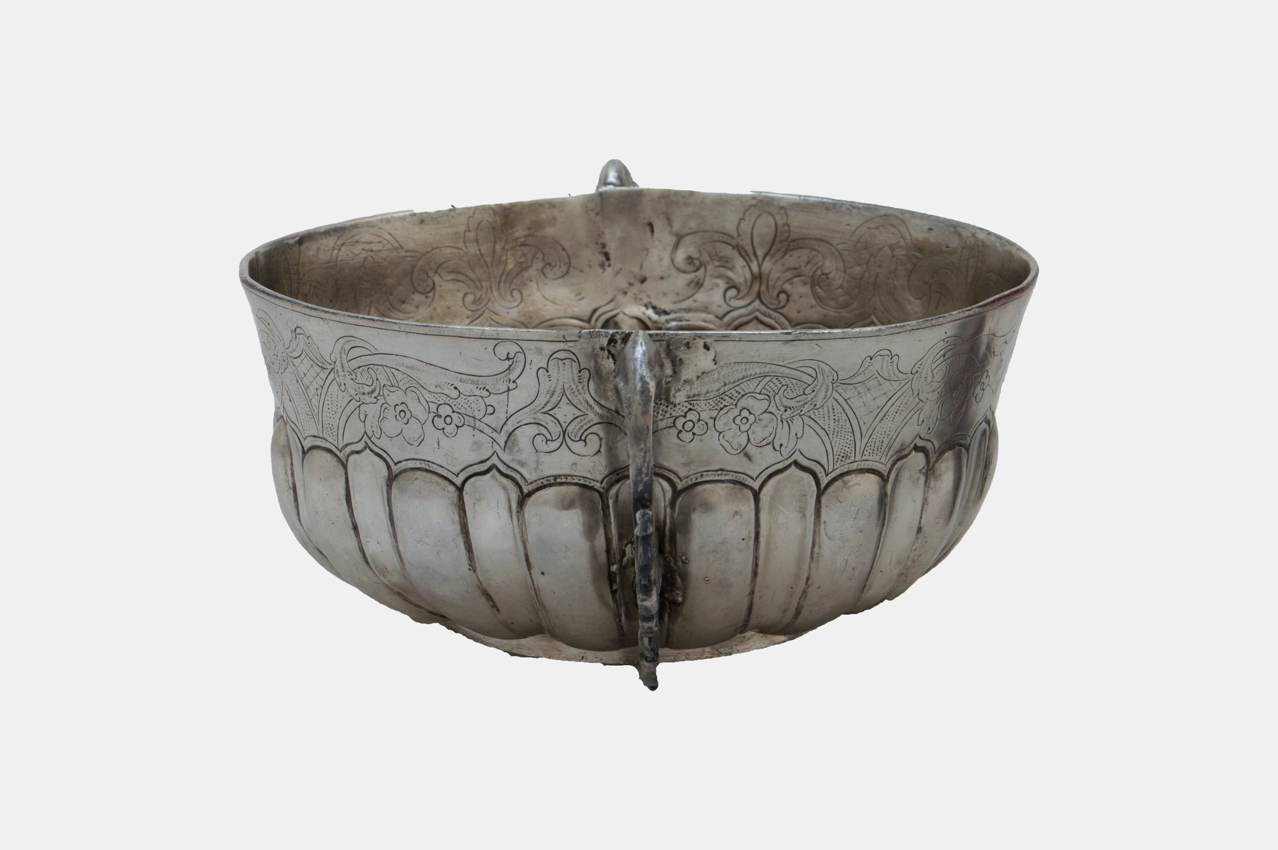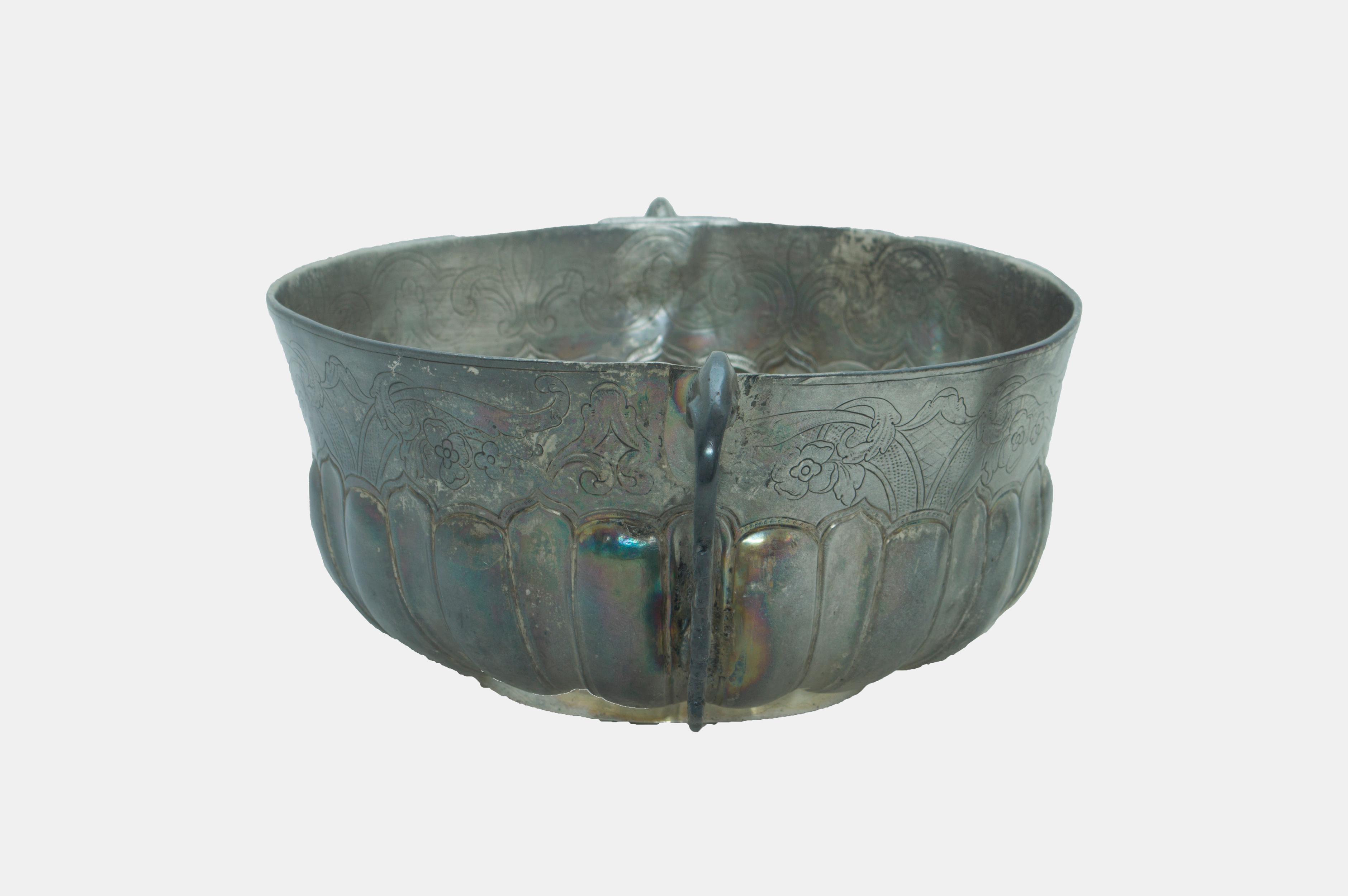 Como objeto de museo, la restauración de esta escudilla no pretendió recuperar su funcionalidad como plato sopero, en cambio, recuperar sus cualidades estéticas es muy importante ya que nos permite reconocer los detalles de su decoración y huellas de manufactura. Imágenes de antes y después de la limpieza electroquímica, repatinado y colocación de capa de protección.