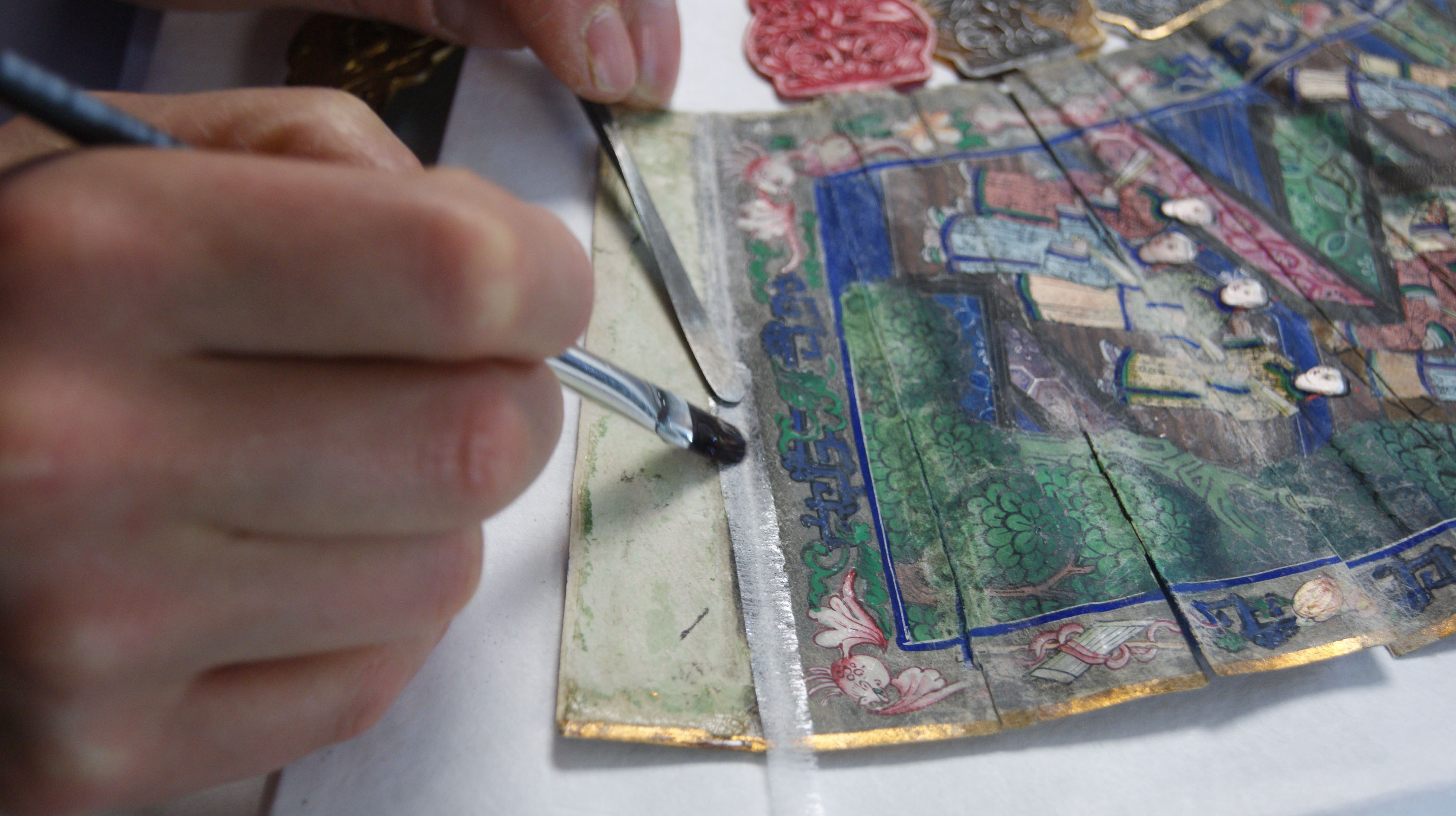 Al colocar refuerzos con papel japonés e hilos de seda para unir las hojas del paisaje, el abanico recobró estabilidad estructural sin perder su capacidad de plegarse sobre si mismo. Además, recuperar la unidad visual de las escenas pintadas promueve nuevas lecturas en torno a su procedencia, técnica de manufactura y representación gráfica.