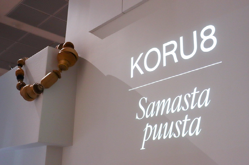 Asiakkaita kuhisevan kahvilan puheensorina jää taakse, kun askelet vievät leveää portaikkoa pitkin toiseen kerrokseen. Oulun taidemuseon tämänkertaisten näyttelyiden nimet on heijastettu porrastasanteen seinälle jättimäisen kierrätyspuutavarasta tehdyn helminauhan viereen. Åströmin entisen tehdasrakennuksen yläkerran jakaa keskenään kaksi taidenäyttelyä, KORU8 ja Samasta puusta.