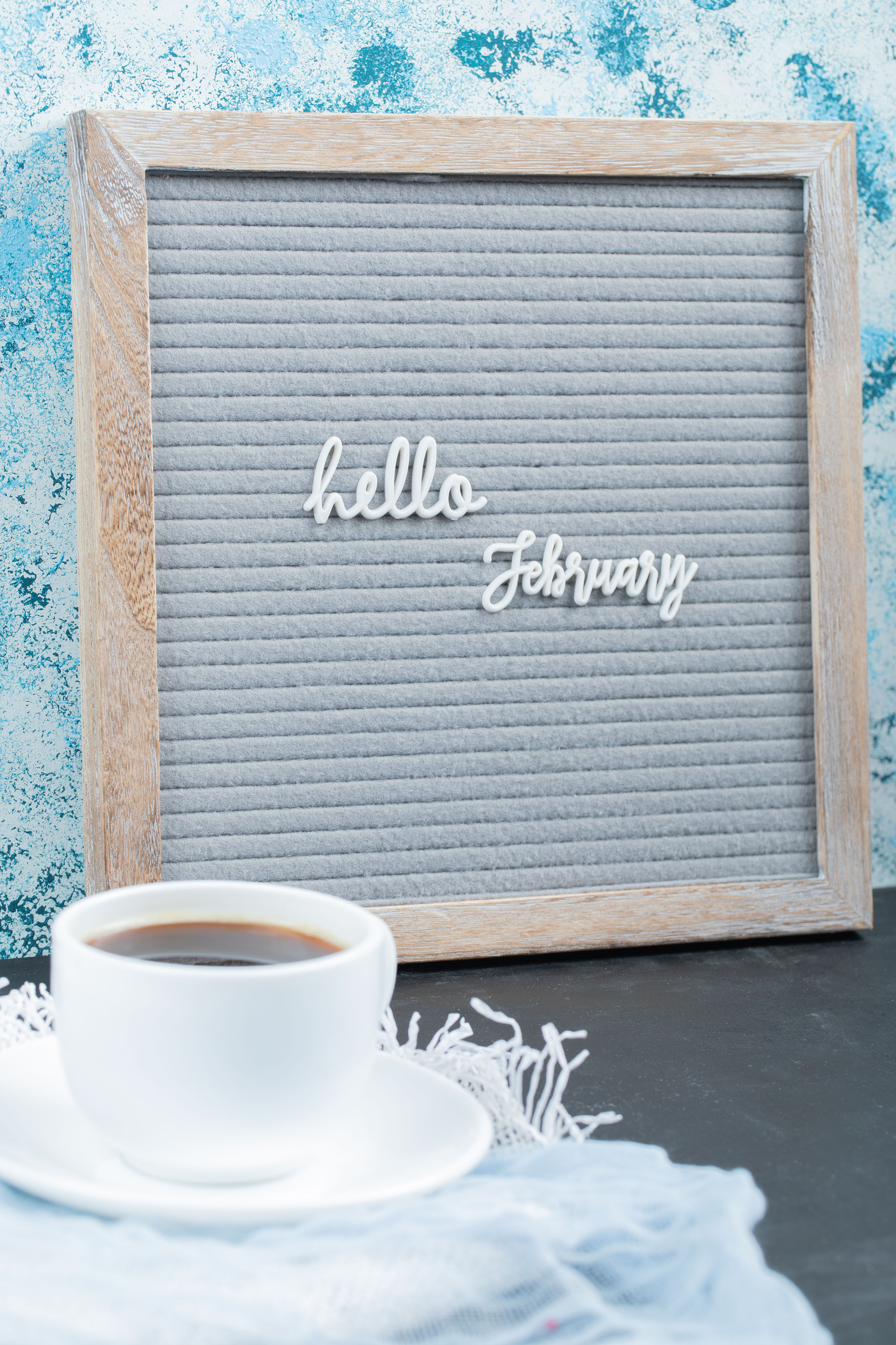 Created with images by rastockinc - "Hello february poster embedded on grey background with a cup of drink aside" • fahrwasser - "Spring or summer dessert table, three tiered tray with desserts" • Prathankarnpap - "Photo of white blank screen computer laptop putting on working desk over comfortable living room as background."