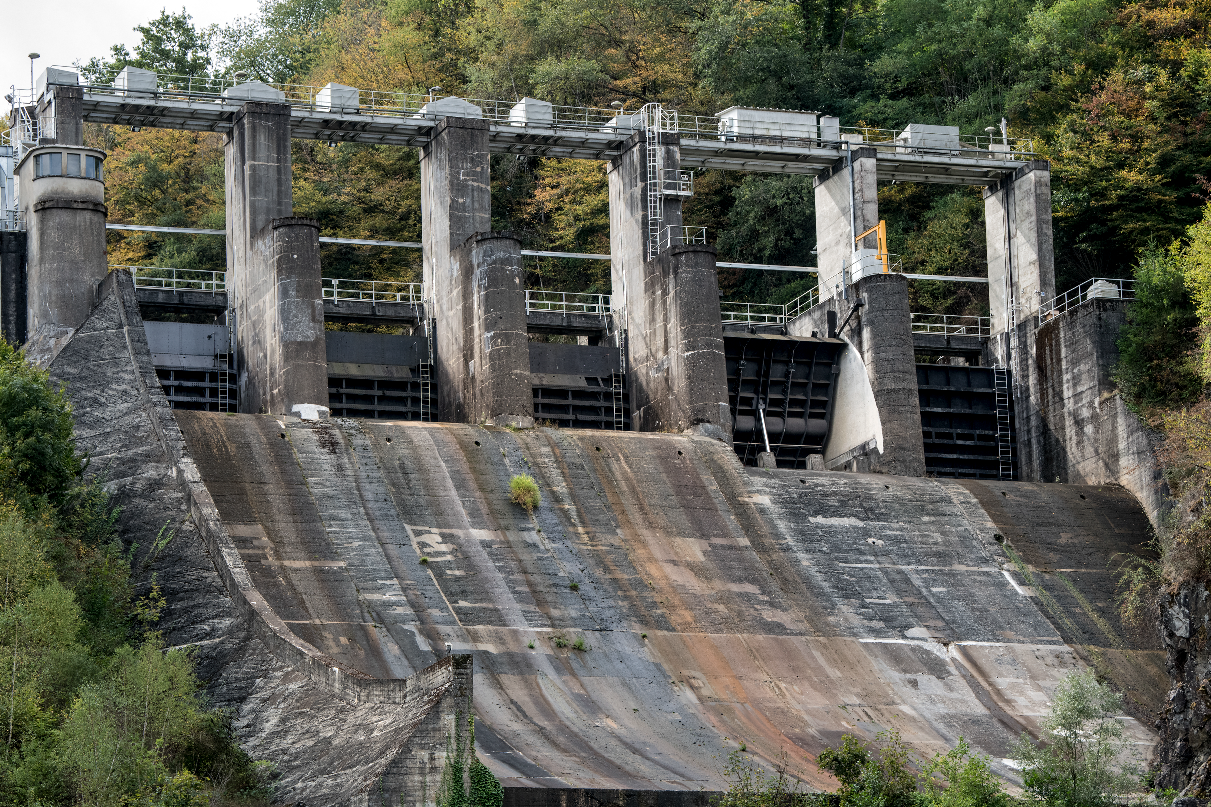 Depuis le poste de commande, les vannes d’évacuation sont manœuvrées en cas de besoin. Il s’agit de faire passer la crue sans causer de dommages à l'ouvrage, de s'assurer que celui-ci n'aggrave pas les impacts de la crue pour les communes et les habitations en aval et, si possible, de les limiter.