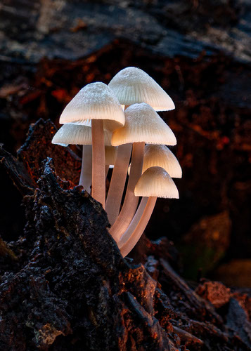 I love looking for mushrooms, toadstools and fungi. They come in all shapes, colours and sizes and are found in all sorts of places. I can spend hours walking around the local woods looking for specimens. Some mushrooms only last a day or two before they are gone until next year. While some last for years and remain seemingly unchanging. Some grow as individual fruits, others in massive clusters. Some are tiny, barely measuring a centimetre or two and some are huge, maybe 30 centimetres across. I need to keep my eyes open and not just look down. I've found great examples way above my head! But most of the time is spent looking down. And once I've spotted a likely candidate it's time to compose that image. Usually down on the damp ground using a black bin liner to stop getting too dirty. Then unpacking my gear, set up lights and set the camera and compose the shot. I can't think of a better way to spend a nice autumn afternoon. Quiet woodland, the sound of the birds, the inquisitive squirrels. The comforting earthy smell of the leaf litter. Looking up to see the light fading and wondered if a bright orange ray of sunlight might just illuminate my subject for a second or two.