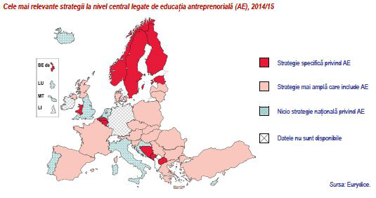Din cele 38 de sisteme educaționale care au participat la studiu, în 11 aveau în anul 2014/15, o strategie specifică privind educația antreprenorială, în timp ce 18 aveau o strategie mai amplă care acoperea și alte domenii de politică, iar 9 nu aveau nicio strategie națională relevantă în acest domeniu. În general, strategiile care se axează exclusiv pe educația antreprenorială sunt considerate a oferi o mai bună acoperire a acestui domeniu, cu o gamă mai amplă de acțiuni și un sprijin sporit pentru implementare.