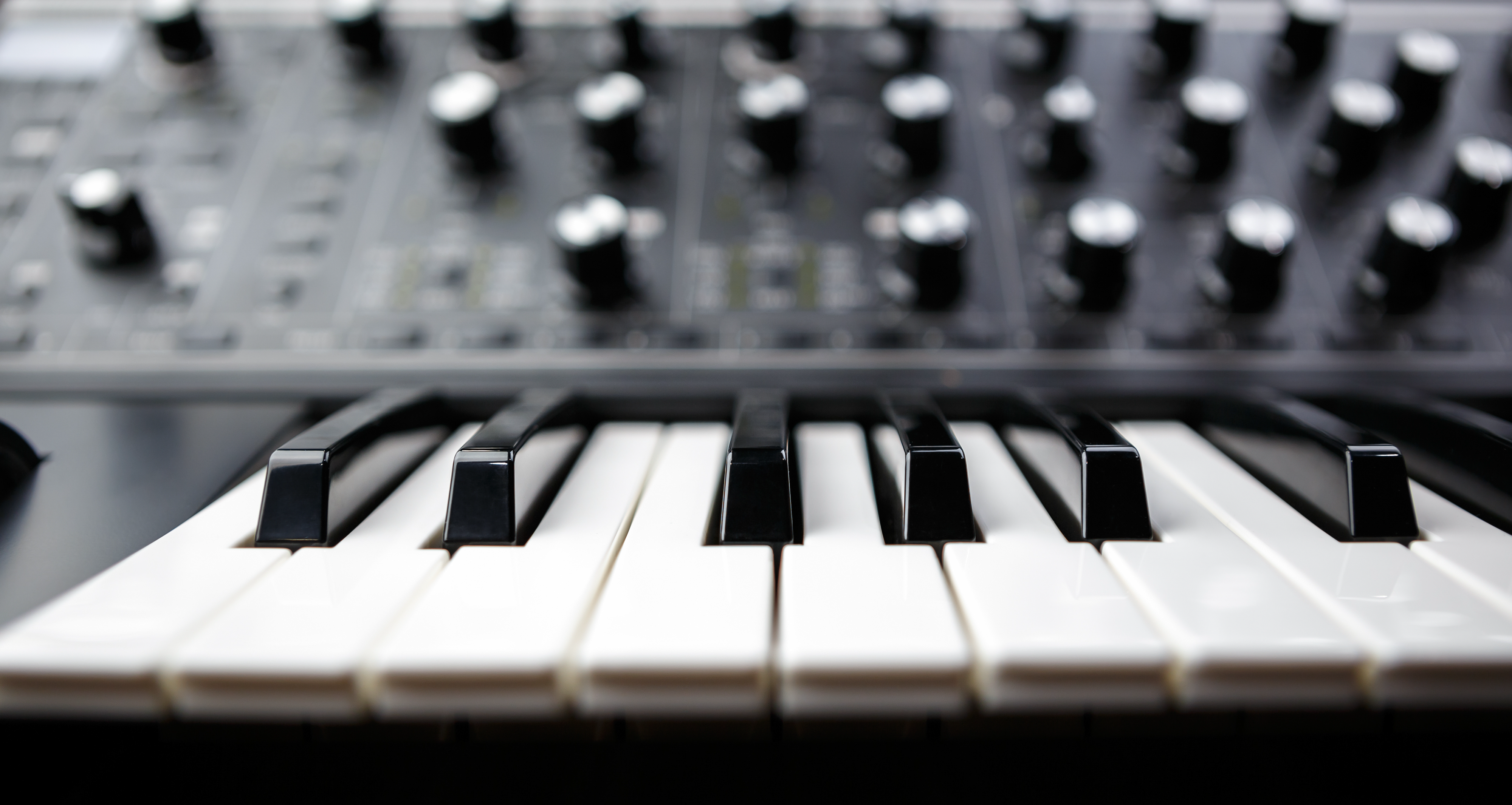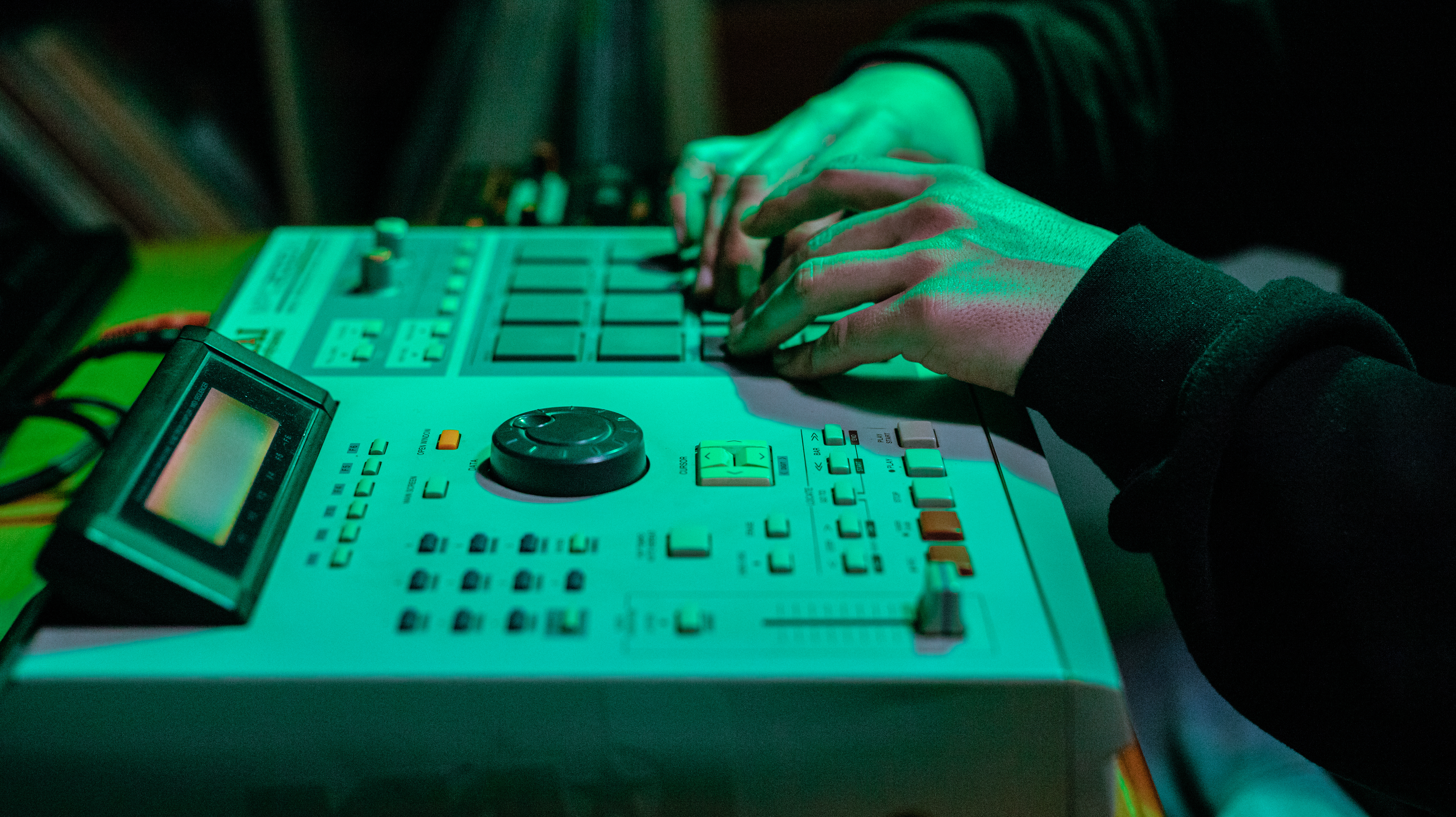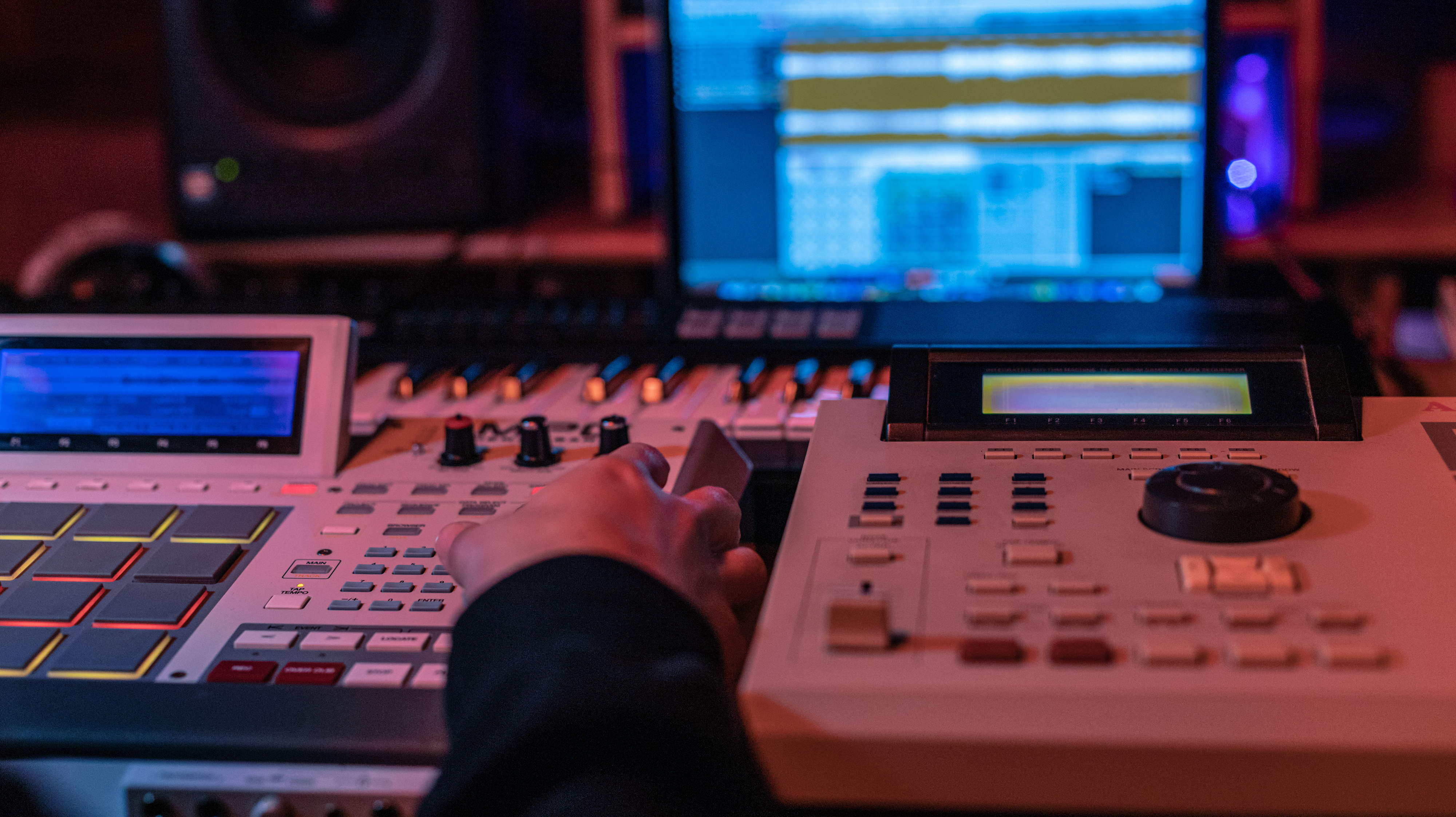 Created with images by Ranto - "The hands of an artist creating music with his drum machines under red light." • hansdenis - "Close up of professional headphones and a Midi keyboard in a music producer home studio. Laptop and window with nature in the background." • hurricanehank - "Electronic piano synthesizer keyboard. Black and white keys on analog synth device for electronic musical production" • Ranto - "The hands of an artist creating music with his drum machines under green light."