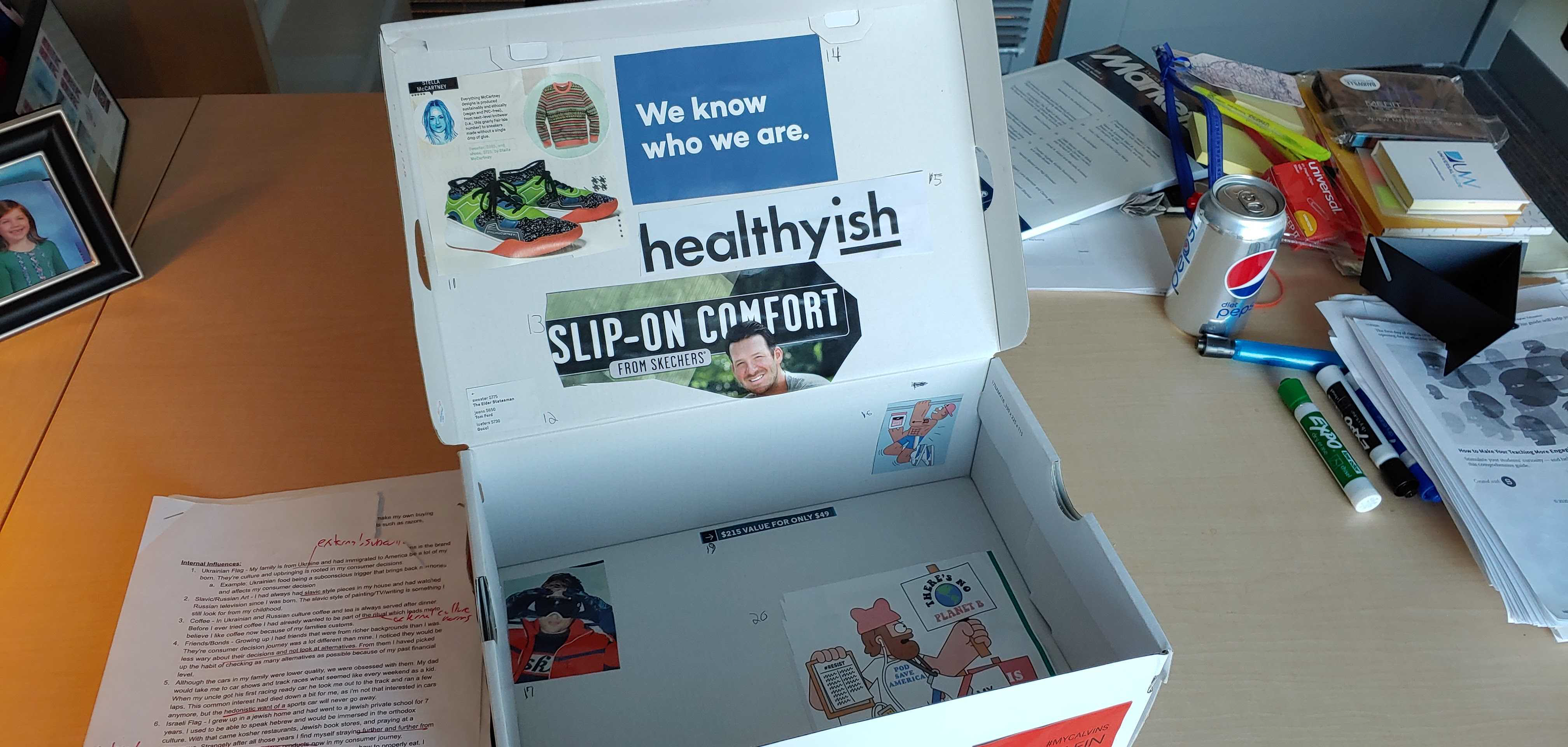 2) Decorate the inside of the box, collage/diorama-style, representing a minimum of 10 specific and unique CONSUMER PSYCHOLOGY/DECISION MAKING influences of consumer behavior on your life. Normally, you'd be able to cut out from magazines, newspapers, photos, puff paints, macrame, or whatever other materials you’d like to use to decorate.