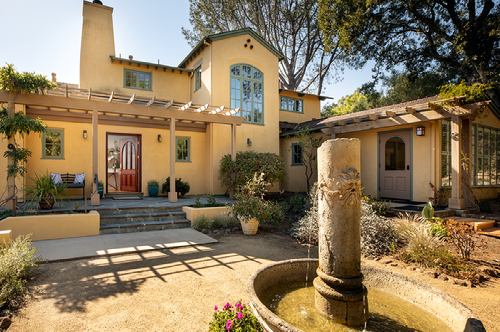 - Enchanting entry with custom front door, stone porch, fountain, and wisteria arbor surrounded by creative garden