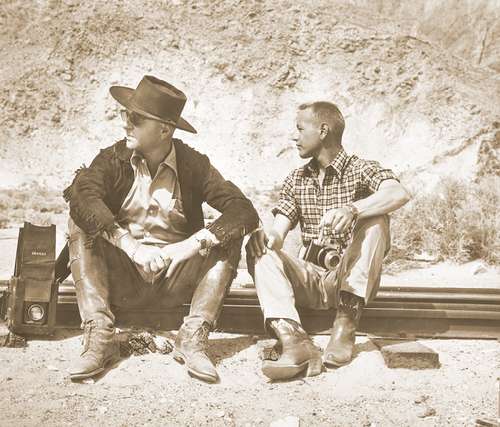 Background image: Lucius Beebe and Charles Clegg at home, photographed by Ernie Mack. Image courtesy of the California State Railroad Museum Library & Archives.